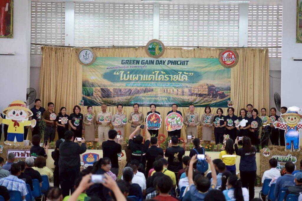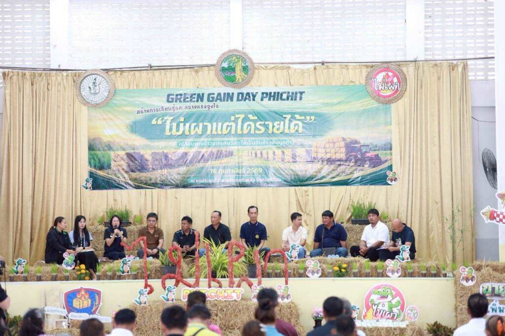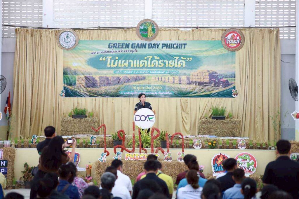 เกษตรพิจิตร ร่วมบูรณาการภาครัฐ เอกชน และเกษตรกรต้นแบบ จัดงาน Green Gain Day วันที่ 16 กุมภาพันธ์ 2569 สำนักงานเกษตรจังหวัดพิจิตร จัดงาน “Green Gain Day” สร้างการเรียนรู้และสร้างแรงจูงใจ “ไม่เผาแต่ได้รายได้” ภายใต้โครงการส่งเสริมการเกษตรที่เป็นมิตรกับสิ่งแวดล้อม โดยมีนางสาวธนียา นัยพินิจ ผู้ว่าราชการจังหวัดพิจิตร เป็นประธานเปิดงาน การจัดงาน ร่วมบูรณาการหน่วยงานภาครัฐและภาคเอกชน รวมถึงเกษตรกรต้นแบบที่ประสบความสำเร็จในการจัดการเศษวัสดุเหลือใช้เพื่อเพิ่มมูลค่าและสร้างรายได้ โดยดำเนินการจัดกิจกรรมให้มีการแลกเปลี่ยนเรียนรู้ ถึงปัญหาและผลกระทบการเผาในพื้นที่การเกษตร สร้างความเข้าใจแก่เกษตรกรผู้ร่วมงาน ถึงโอกาสในการสร้างรายได้ ภายใต้แนวคิด “ทำไมไม่เผาแล้วได้รายได้” ผ่านการบริหารจัดการวัสดุเหลือใช้ทางการเกษตรอย่างยั่งยืน