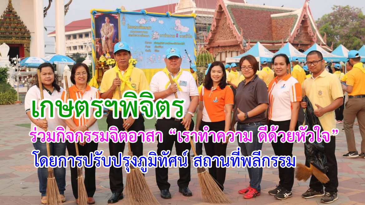 คนวันที่ 14 มีนาคม 2562 เวลา 07.00 น. นายกิตติชาติ ชาติยานนท์ เกษตรจังหวัดพิจิตร พร้อมด้วย ข้าราชการและเจ้าหน้าที่สำนักงานเกษตรจังหวัดพิจิตร และสำนักงานเกษตรอำเภอเมืองพิจิตร ร่วมกิจกรรมจิตอาสา “เราทำความ ดี ด้วยหัวใจ”โดยการปรับปรุงภูมิทัศน์ สถานที่พลีกรรม ณ วัดท่าหลวง อำเภอเมืองพิจิตร จังหวัดพิจิตร