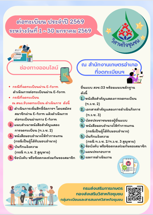 ประชาสัมพันธ์ การต่อทะเบียนวิสาหกิจชุมชน ประจำปี 2569