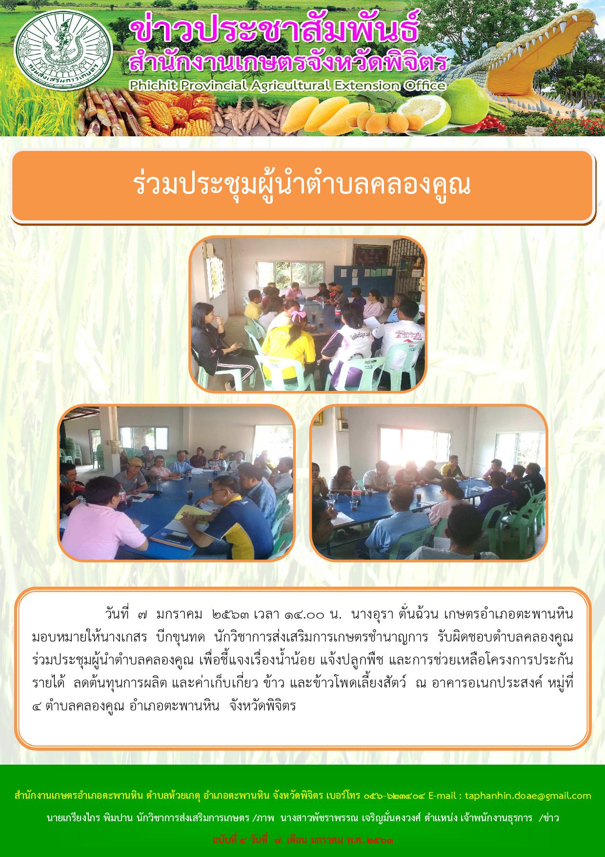 วันที่ 7 มกราคม 2563 เวลา 14.00 น. นางอุรา ตั่นฉ้วน เกษตรอำเภอตะพานหิน มอบหมายให้นางเกสร บีกขุนทด นักวิชาการส่งเสริมการเกษตรชำนาญการ รับผิดชอบตำบลคลองคูณ ร่วมประชุมผู้นำตำบลคลองคูณ เพื่อชี้แจงเรื่องน้ำน้อย แจ้งปลูกพืช และการช่วยเหลือโครงการประกันรายได้ ลดต้นทุนการผลิต และค่าเก็บเกี่ยว ข้าว และข้าวโพดเลี้ยงสัตว์ ณ อาคารอเนกประสงค์ หมู่ที่ 4 ตำบลคลองคูณ อำเภอตะพานหิน จังหวัดพิจิตร
