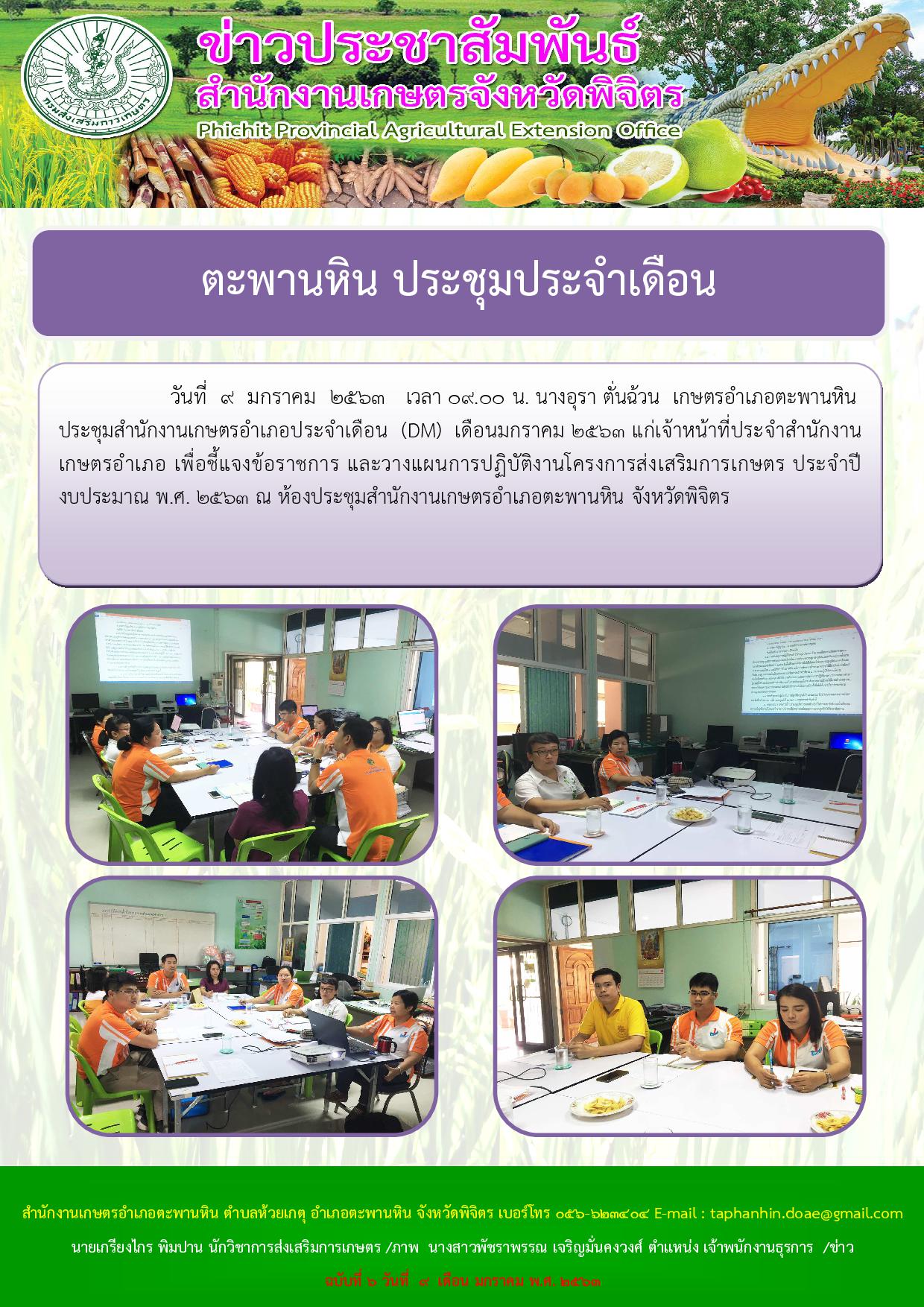 วันที่ 9 มกราคม ๒๕๖3 เวลา ๐๙.0๐ น. นางอุรา ตั่นฉ้วน เกษตรอำเภอตะพานหิน ประชุมสำนักงานเกษตรอำเภอประจำเดือน (DM) เดือนมกราคม ๒๕๖3 แก่เจ้าหน้าที่ประจำสำนักงานเกษตรอำเภอ เพื่อชี้แจงข้อราชการ และวางแผนการปฏิบัติงานโครงการส่งเสริมการเกษตร ประจำปีงบประมาณ พ.ศ. ๒5๖๓ ณ ห้องประชุมสำนักงานเกษตรอำเภอตะพานหิน จังหวัดพิจิตร