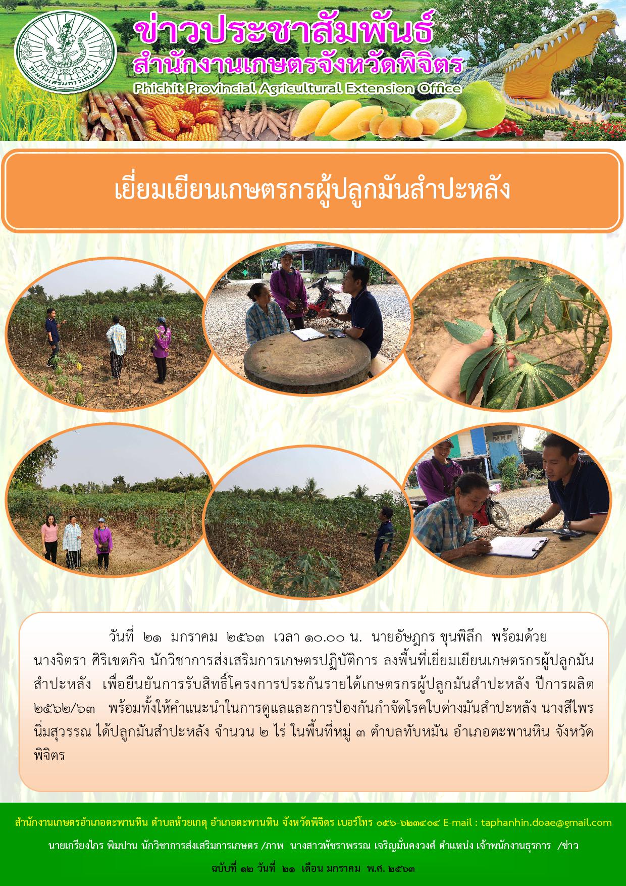 วันที่ 21 มกราคม 2563 เวลา 10.00 น. นายอัษฎกร ขุนพิลึก พร้อมด้วยนางจิตรา ศิริเขตกิจ นักวิชาการส่งเสริมการเกษตรปฏิบัติการ ลงพื้นที่เยี่ยมเยียนเกษตรกรผู้ปลูกมันสำปะหลัง เพื่อยืนยันการรับสิทธิ์โครงการประกันรายได้เกษตรกรผู้ปลูกมันสำปะหลัง ปีการผลิต 2562/63 พร้อมทั้งให้คำแนะนำในการดูแลและการป้องกันกำจัดโรคใบด่างมันสำปะหลัง นางสีไพร นิ่มสุวรรณ ได้ปลูกมันสำปะหลัง จำนวน 2 ไร่ ในพื้นที่หมู่ 3 ตำบลทับหมัน อำเภอตะพานหิน จังหวัดพิจิตร
