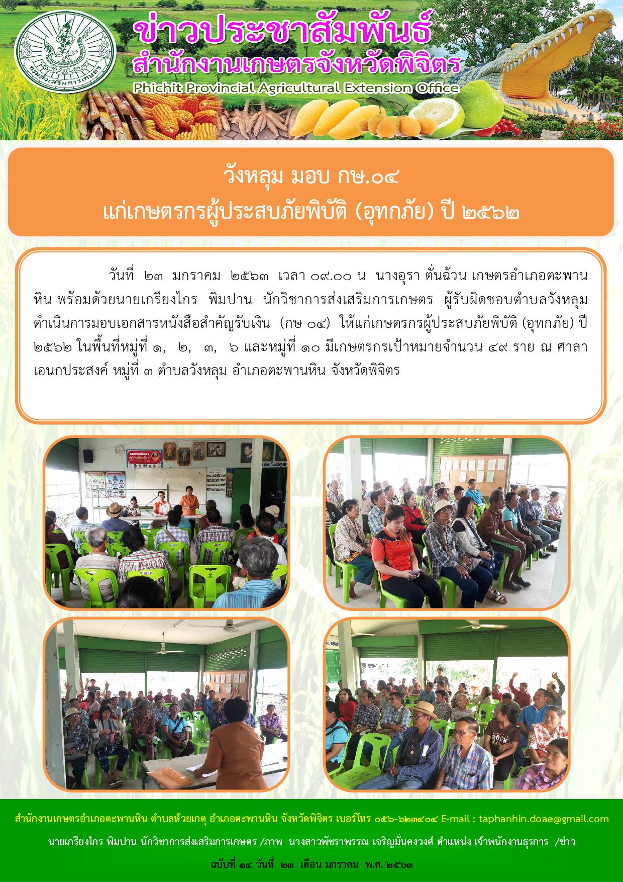 วันที่ 23 มกราคม 2563 เวลา 09.00 น นางอุรา ตั่นฉ้วน เกษตรอำเภอตะพานหิน พร้อมด้วยนายเกรียงไกร พิมปาน นักวิชาการส่งเสริมการเกษตร ผู้รับผิดชอบตำบลวังหลุม ดำเนินการมอบเอกสารหนังสือสำคัญรับเงิน (กษ 04) ให้แก่เกษตรกรผู้ประสบภัยพิบัติ (อุทกภัย) ปี 2562 ในพื้นที่หมู่ที่ 1, 2, 3, 6 และหมู่ที่ 10 มีเกษตรกรเป้าหมายจำนวน 49 ราย ณ ศาลาเอนกประสงค์ หมู่ที่ 3 ตำบลวังหลุม อำเภอตะพานหิน จังหวัดพิจิตร