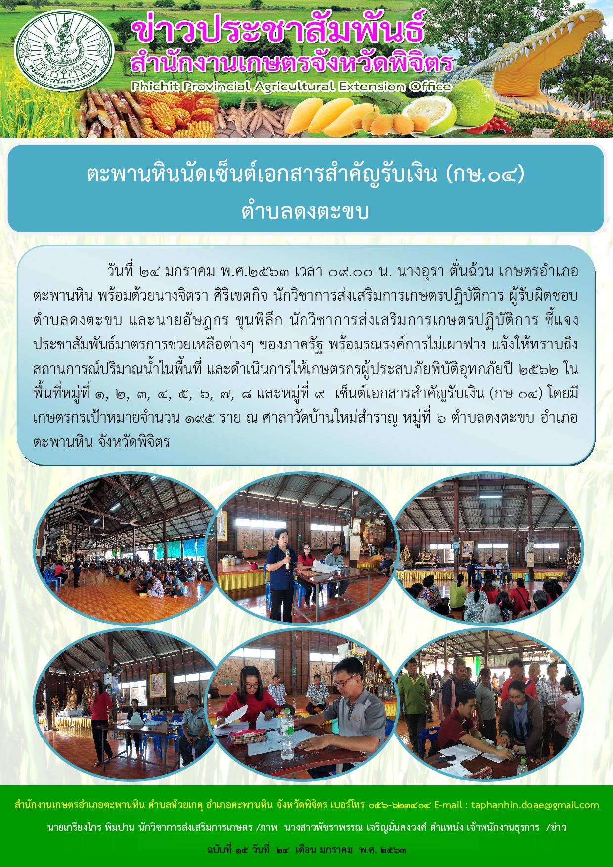 วันที่ 24 มกราคม พ.ศ.2563 เวลา 09.00 น. นางอุรา ตั่นฉ้วน เกษตรอำเภอตะพานหิน พร้อมด้วยนางจิตรา ศิริเขตกิจ นักวิชาการส่งเสริมการเกษตรปฏิบัติการ ผู้รับผิดชอบตำบลดงตะขบ และนายอัษฎกร ขุนพิลึก นักวิชาการส่งเสริมการเกษตรปฏิบัติการ ชี้แจงประชาสัมพันธ์มาตรการช่วยเหลือต่างๆ ของภาครัฐ พร้อมรณรงค์การไม่เผาฟาง แจ้งให้ทราบถึงสถานการณ์ปริมาณน้ำในพื้นที่ และดำเนินการให้เกษตรกรผู้ประสบภัยพิบัติอุทกภัยปี 2562 ในพื้นที่หมู่ที่ 1, 2, 3, 4, 5, 6, 7, 8 และหมู่ที่ 9 เซ็นต์เอกสารสำคัญรับเงิน (กษ 04) โดยมีเกษตรกรเป้าหมายจำนวน 195 ราย ณ ศาลาวัดบ้านใหม่สำราญ หมู่ที่ 6 ตำบลดงตะขบ อำเภอตะพานหิน จังหวัดพิจิตร