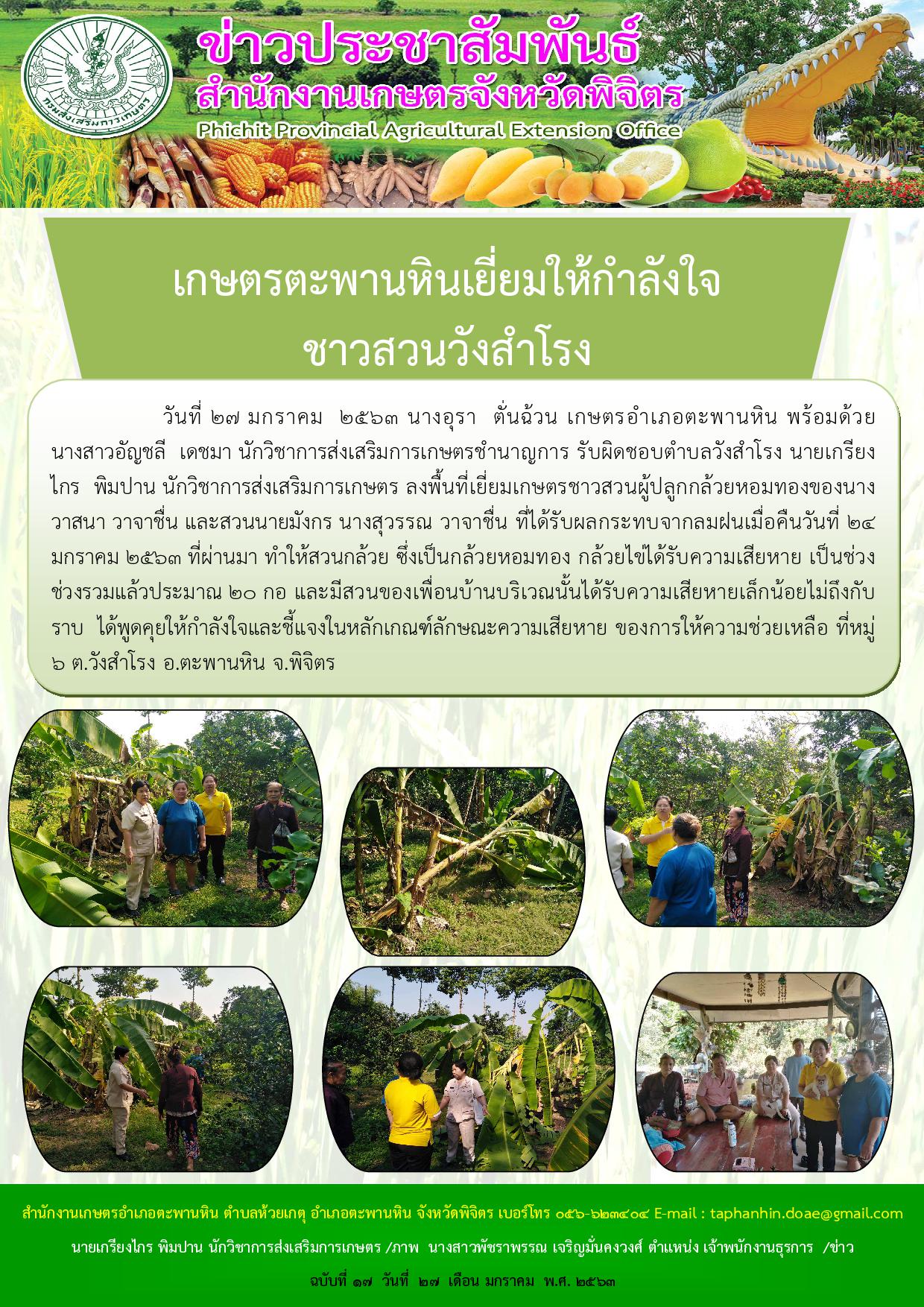 วันที่ 27 มกราคม 2563 นางอุรา ตั่นฉ้วน เกษตรอำเภอตะพานหิน พร้อมด้วยนางสาวอัญชลี เดชมา นักวิชาการส่งเสริมการเกษตรชำนาญการ รับผิดชอบตำบลวังสำโรง นายเกรียงไกร พิมปาน นักวิชาการส่งเสริมการเกษตร ลงพื้นที่เยี่ยมเกษตรชาวสวนผู้ปลูกกล้วยหอมทองของนางวาสนา วาจาชื่น และสวนนายมังกร นางสุวรรณ วาจาชื่น ที่ได้รับผลกระทบจากลมฝนเมื่อคืนวันที่ 24 มกราคม 2563 ที่ผ่านมา ทำให้สวนกล้วย ซึ่งเป็นกล้วยหอมทอง กล้วยไข่ได้รับความเสียหาย เป็นช่วงช่วงรวมแล้วประมาณ 20 กอ และมีสวนของเพื่อนบ้านบริเวณนั้นได้รับความเสียหายเล็กน้อยไม่ถึงกับราบ ได้พูดคุยให้กำลังใจและชี้แจงในหลักเกณฑ์ลักษณะความเสียหาย ของการให้ความช่วยเหลือ ที่หมู่ 6 ต.วังสำโรง อ.ตะพานหิน จ.พิจิตร