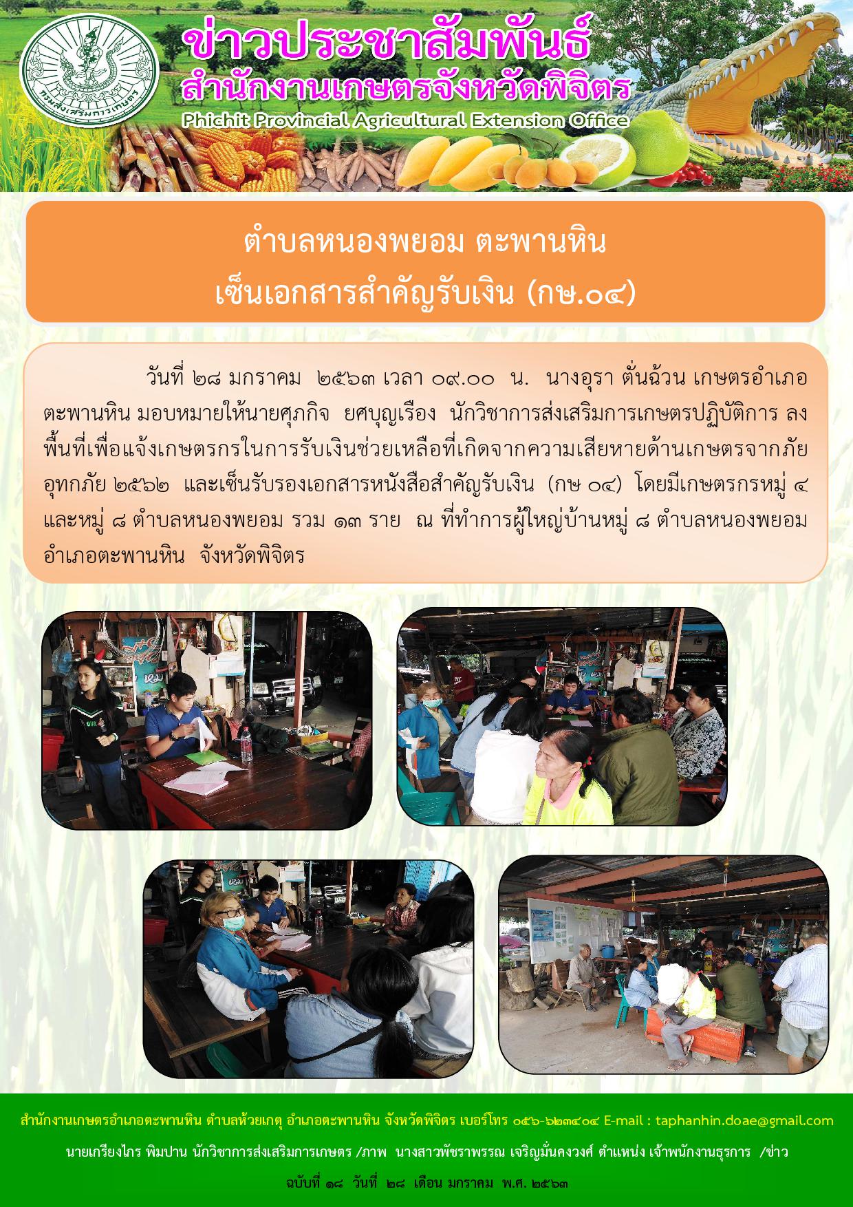 วันที่ 28 มกราคม 2563 เวลา 09.00 น. นางอุรา ตั่นฉ้วน เกษตรอำเภอตะพานหิน มอบหมายให้นายศุภกิจ ยศบุญเรือง นักวิชาการส่งเสริมการเกษตรปฏิบัติการ ลงพื้นที่เพื่อแจ้งเกษตรกรในการรับเงินช่วยเหลือที่เกิดจากความเสียหายด้านเกษตรจากภัยอุทกภัย 2562 และเซ็นรับรองเอกสารหนังสือสำคัญรับเงิน (กษ 04) โดยมีเกษตรกรหมู่ 4 และหมู่ 8 ตำบลหนองพยอม รวม 13 ราย ณ ที่ทำการผู้ใหญ่บ้านหมู่ 8 ตำบลหนองพยอม อำเภอตะพานหิน จังหวัดพิจิตร