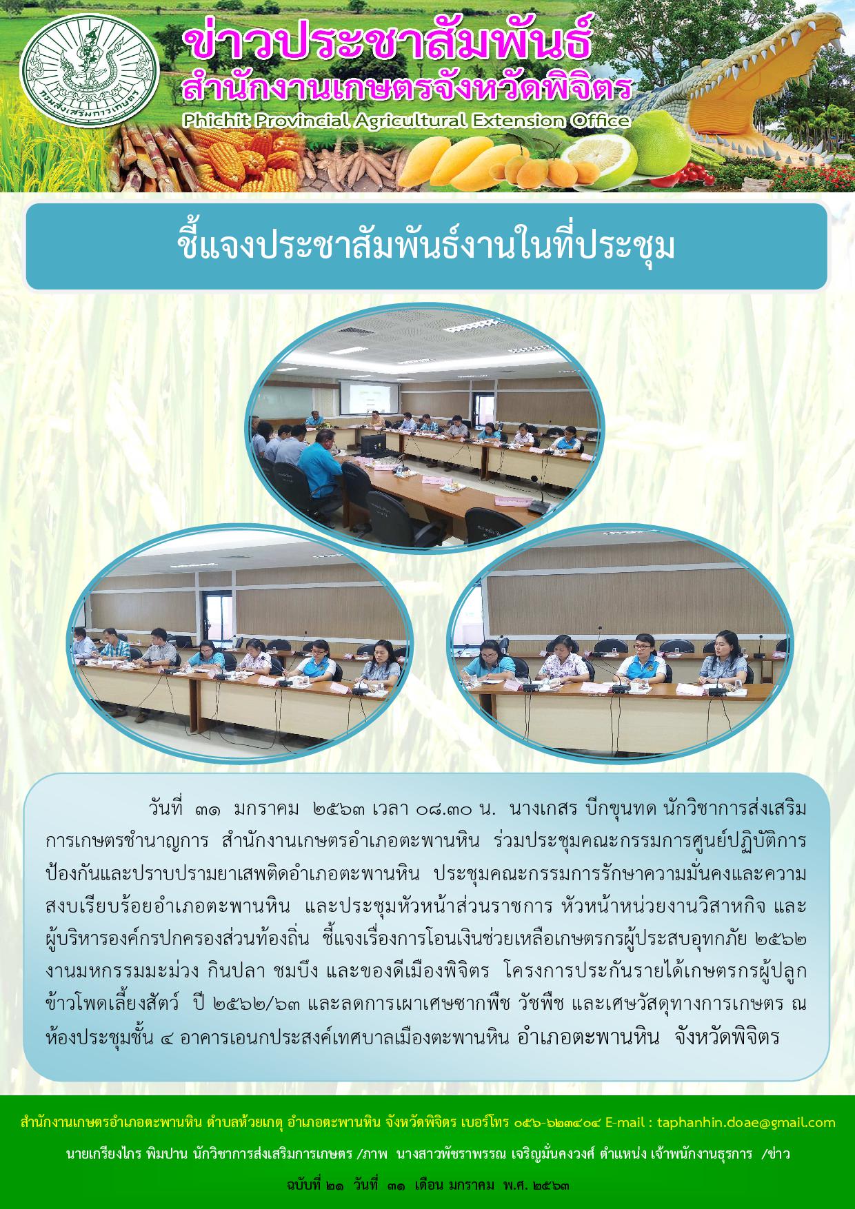 วันที่ 31 มกราคม 2563 เวลา 08.30 น. นางเกสร บีกขุนทด นักวิชาการส่งเสริมการเกษตรชำนาญการ สำนักงานเกษตรอำเภอตะพานหิน ร่วมประชุมคณะกรรมการศูนย์ปฏิบัติการป้องกันและปราบปรามยาเสพติดอำเภอตะพานหิน ประชุมคณะกรรมการรักษาความมั่นคงและความสงบเรียบร้อยอำเภอตะพานหิน และประชุมหัวหน้าส่วนราชการ หัวหน้าหน่วยงานวิสาหกิจ และผู้บริหารองค์กรปกครองส่วนท้องถิ่น ชี้แจงเรื่องการโอนเงินช่วยเหลือเกษตรกรผู้ประสบอุทกภัย 2562 งานมหกรรมมะม่วง กินปลา ชมบึง และของดีเมืองพิจิตร โครงการประกันรายได้เกษตรกรผู้ปลูกข้าวโพดเลี้ยงสัตว์ ปี 2562/63 และลดการเผาเศษซากพืช วัชพืช และเศษวัสดุทางการเกษตร ณ ห้องประชุมชั้น 4 อาคารเอนกประสงค์เทศบาลเมืองตะพานหิน อำเภอตะพานหิน จังหวัดพิจิตร