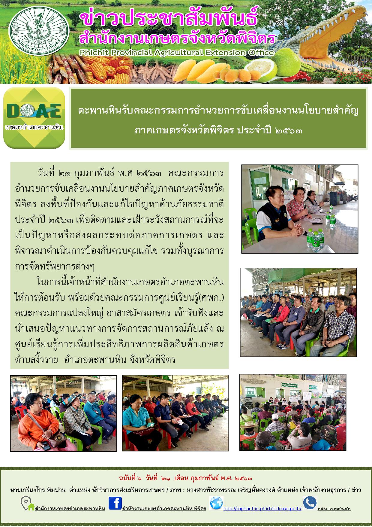 วันที่ 21 กุมภาพันธ์ พ.ศ 2563 คณะกรรมการอำนวยการขับเคลื่อนงานนโยบายสำคัญภาคเกษตรจังหวัดพิจิตร ลงพื้นที่ป้องกันและแก้ไขปัญหาด้านภัยธรรมชาติ ประจำปี 2563 เพื่อติดตามและเฝ้าระวังสถานการณ์ที่จะเป็นปัญหาหรือส่งผลกระทบต่อภาคการเกษตร และพิจารณาดำเนินการป้องกันควบคุมแก้ไข รวมทั้งบูรณาการการจัดทรัพยากรต่างๆ