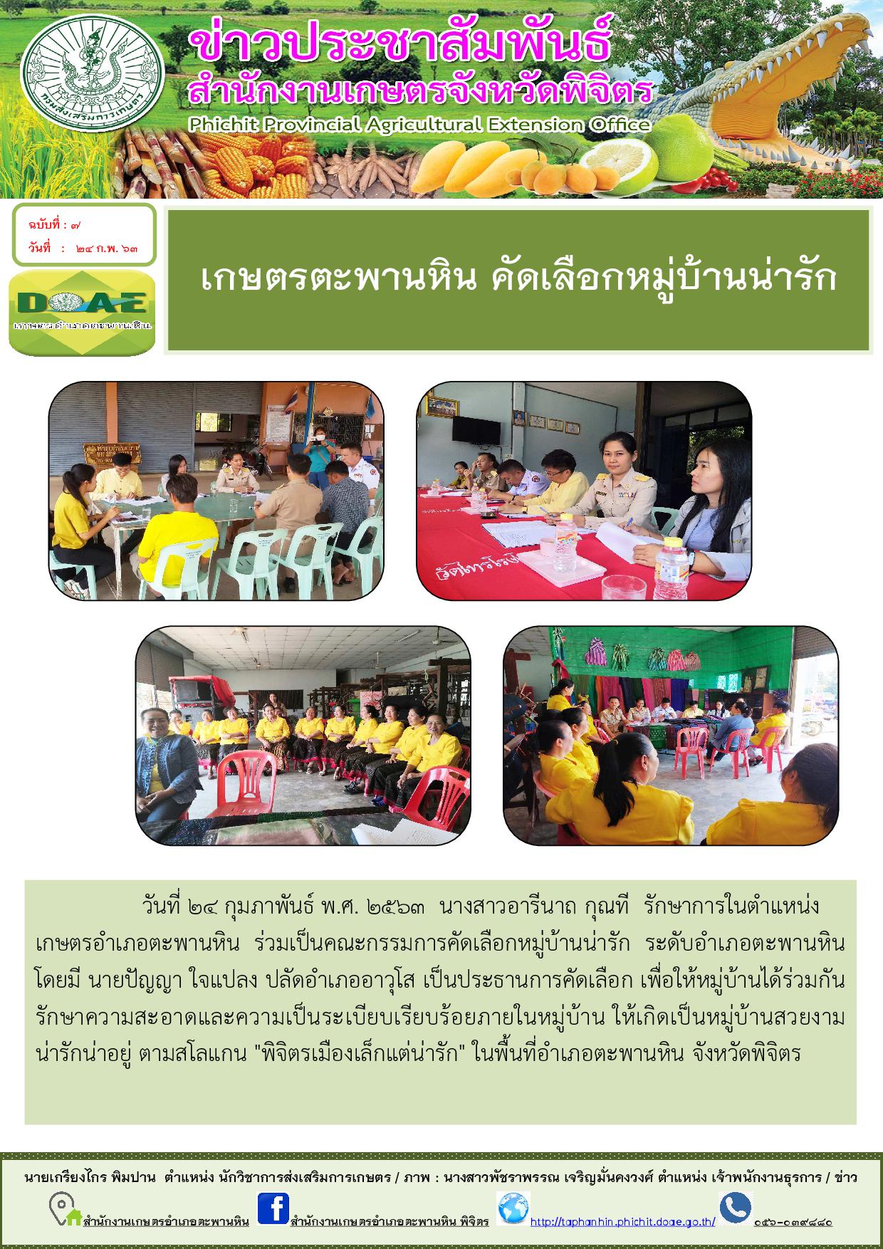 วันที่ 24 กุมภาพันธ์ พ.ศ. 2563 นางสาวอารีนาถ กุณที รักษาการในตำแหน่งเกษตรอำเภอตะพานหิน ร่วมเป็นคณะกรรมการคัดเลือกหมู่บ้านน่ารัก ระดับอำเภอตะพานหิน โดยมี นายปัญญา ใจแปลง ปลัดอำเภออาวุโส เป็นประธานการคัดเลือก เพื่อให้หมู่บ้านได้ร่วมกันรักษาความสะอาดและความเป็นระเบียบเรียบร้อยภายในหมู่บ้าน ให้เกิดเป็นหมู่บ้านสวยงามน่ารักน่าอยู่ ตามสโลแกน “พิจิตรเมืองเล็กแต่น่ารัก” ในพื้นที่อำเภอตะพานหิน จังหวัดพิจิตร