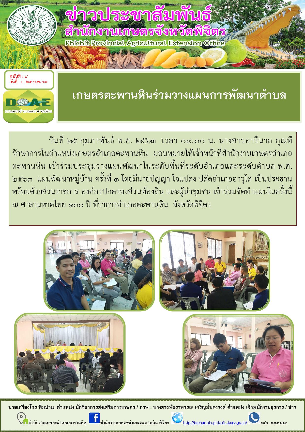 วันที่ 25 กุมภาพันธ์ พ.ศ. 2563 เวลา 09.00 น. นางสาวอารีนาถ กุณที รักษาการในตำแหน่งเกษตรอำเภอตะพานหิน มอบหมายให้เจ้าหน้าที่สำนักงานเกษตรอำเภอตะพานหิน เข้าร่วมประชุมวางแผนพัฒนาในระดับพื้นที่ระดับอำเภอและระดับตำบล พ.ศ. 2563 แผนพัฒนาหมู่บ้าน ครั้งที่ 1 โดยมีนายปัญญา ใจแปลง ปลัดอำเภออาวุโส เป็นประธาน พร้อมด้วยส่วนราชการ องค์กรปกครองส่วนท้องถิ่น และผู้นำชุมชน เข้าร่วมจัดทำแผนในครั้งนี้ ณ ศาลามหาดไทย 100 ปี ที่ว่าการอำเภอตะพานหิน จังหวัดพิจิตร