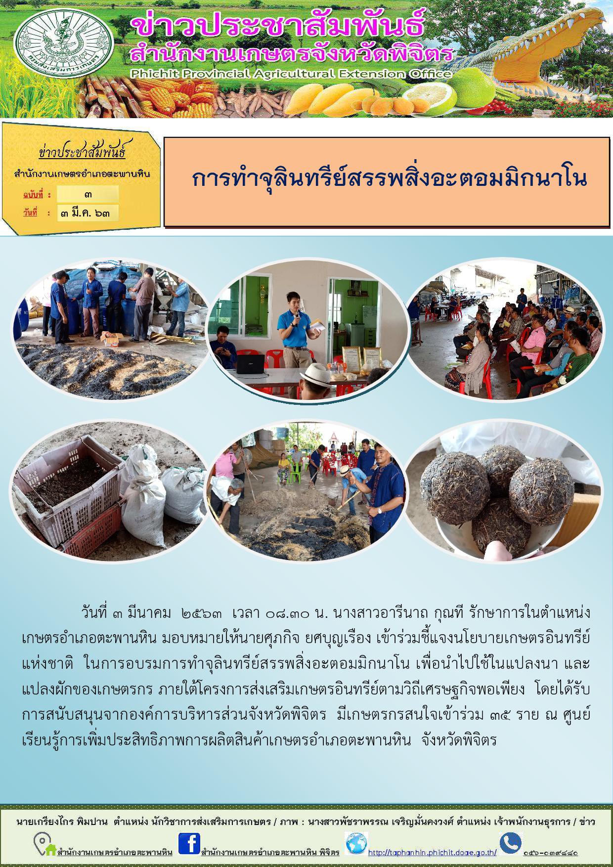 วันที่ 3 มีนาคม ๒๕๖3 เวลา ๐8.3๐ น. นางสาวอารีนาถ กุณที รักษาการในตำแหน่งเกษตรอำเภอตะพานหิน มอบหมายให้นายศุภกิจ ยศบุญเรือง เข้าร่วมชี้แจงนโยบายเกษตรอินทรีย์แห่งชาติ ในการอบรมการทำจุลินทรีย์สรรพสิ่งอะตอมมิกนาโน เพื่อนำไปใช้ในแปลงนา และแปลงผักของเกษตรกร ภายใต้โครงการส่งเสริมเกษตรอินทรีย์ตามวิถีเศรษฐกิจพอเพียง โดยได้รับการสนับสนุนจากองค์การบริหารส่วนจังหวัดพิจิตร มีเกษตรกรสนใจเข้าร่วม 35 ราย ณ ศูนย์เรียนรู้การเพิ่มประสิทธิภาพการผลิตสินค้าเกษตรอำเภอตะพานหิน จังหวัดพิจิตร