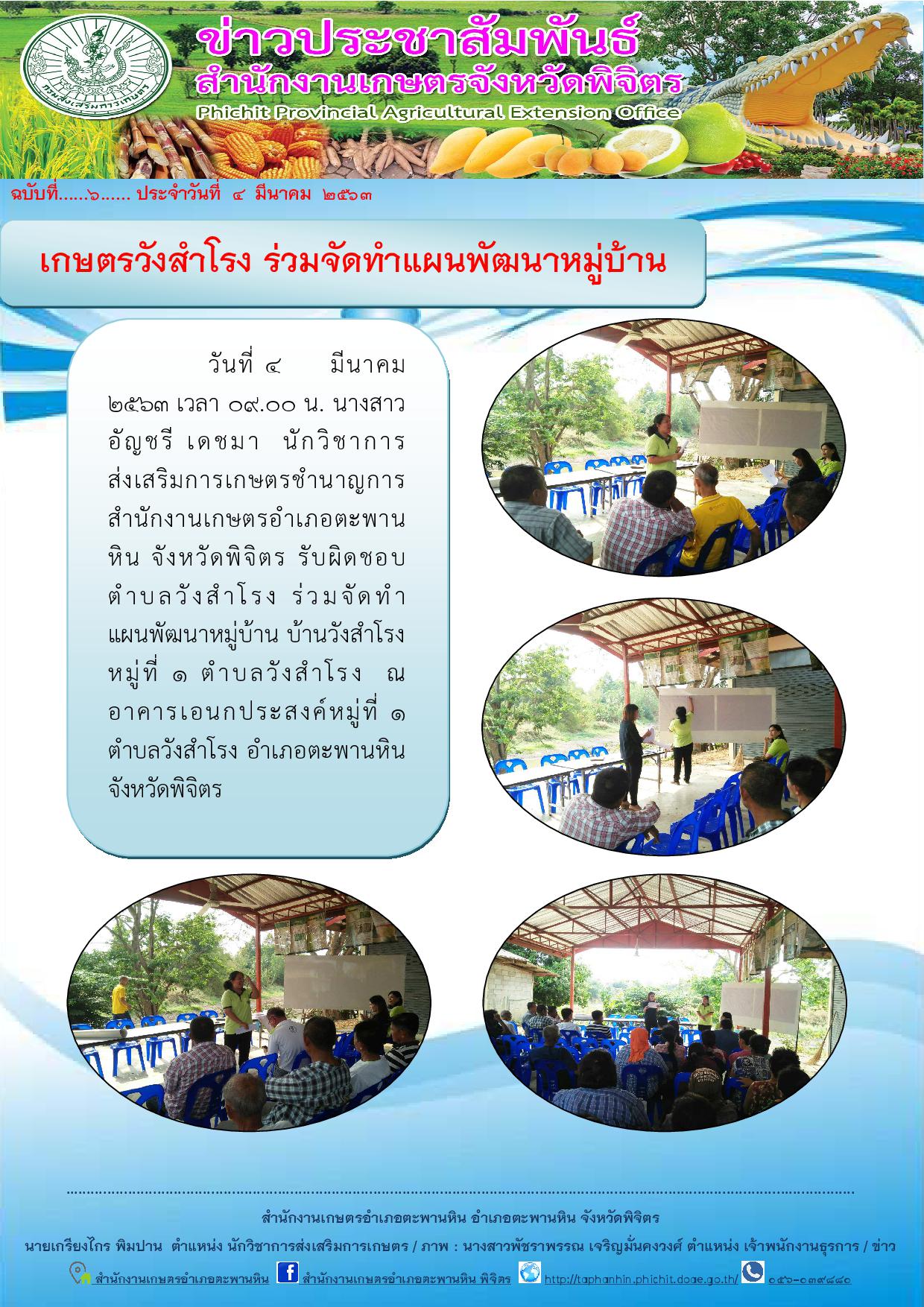 วันที่ 4 มีนาคม 2563 เวลา 09.00 น. นางสาวอัญชรี เดชมา นักวิชาการส่งเสริมการเกษตรชำนาญการ สำนักงานเกษตรอำเภอตะพานหิน จังหวัดพิจิตร รับผิดชอบตำบลวังสำโรง ร่วมจัดทำแผนพัฒนาหมู่บ้าน บ้านวังสำโรงหมู่ที่ 1 ตำบลวังสำโรง ณ อาคารเอนกประสงค์หมู่ที่ 1 ตำบลวังสำโรง อำเภอตะพานหิน จังหวัดพิจิตร