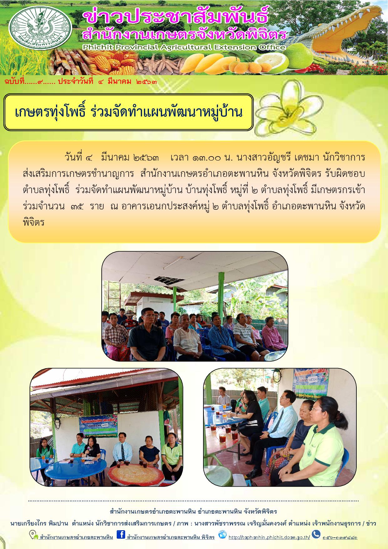 วันที่ 4 มีนาคม 2563 เวลา 13.00 น. นางสาวอัญชรี เดชมา นักวิชาการส่งเสริมการเกษตรชำนาญการ สำนักงานเกษตรอำเภอตะพานหิน จังหวัดพิจิตร รับผิดชอบตำบลทุ่งโพธิ์ ร่วมจัดทำแผนพัฒนาหมู่บ้าน บ้านทุ่งโพธิ์ หมู่ที่ 2 ตำบลทุ่งโพธิ์ มีเกษตรกรเข้าร่วมจำนวน 35 ราย ณ อาคารเอนกประสงค์หมู่ 2 ตำบลทุ่งโพธิ์ อำเภอตะพานหิน จังหวัดพิจิตร