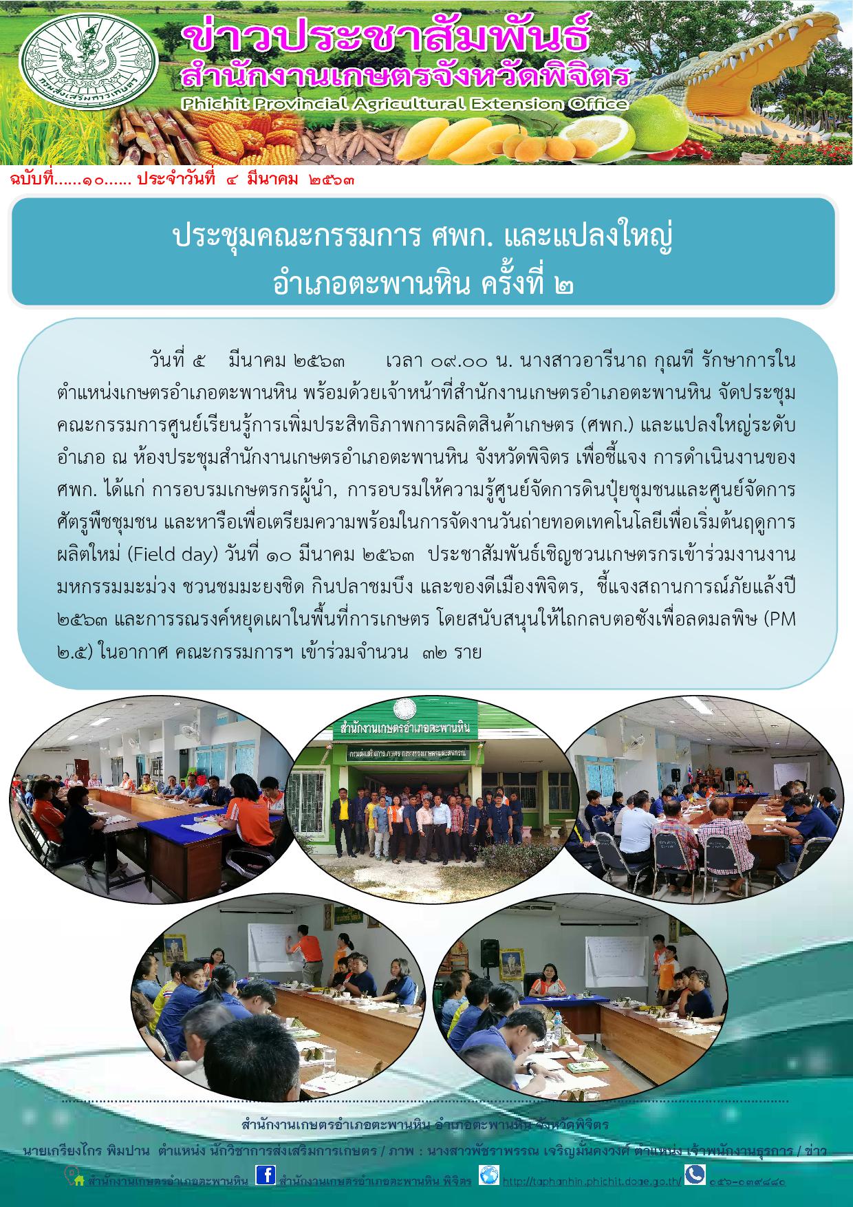 วันที่ 5 มีนาคม 2563 เวลา 09.00 น. นางสาวอารีนาถ กุณที รักษาการในตำแหน่งเกษตรอำเภอตะพานหิน พร้อมด้วยเจ้าหน้าที่สำนักงานเกษตรอำเภอตะพานหิน จัดประชุมคณะกรรมการศูนย์เรียนรู้การเพิ่มประสิทธิภาพการผลิตสินค้าเกษตร (ศพก.) และแปลงใหญ่ระดับอำเภอ ณ ห้องประชุมสำนักงานเกษตรอำเภอตะพานหิน จังหวัดพิจิตร เพื่อชี้แจง การดำเนินงานของศพก. ได้แก่ การอบรมเกษตรกรผู้นำ, การอบรมให้ความรู้ศูนย์จัดการดินปุ๋ยชุมชนและศูนย์จัดการศัตรูพืชชุมชน และหารือเพื่อเตรียมความพร้อมในการจัดงานวันถ่ายทอดเทคโนโลยีเพื่อเริ่มต้นฤดูการผลิตใหม่ (Field day) วันที่ 10 มีนาคม 2563 ประชาสัมพันธ์เชิญชวนเกษตรกรเข้าร่วมงานงานมหกรรมมะม่วง ชวนชมมะยงชิด กินปลาชมบึง และของดีเมืองพิจิตร, ชี้แจงสถานการณ์ภัยแล้งปี 2563 และการรณรงค์หยุดเผาในพื้นที่การเกษตร โดยสนับสนุนให้ไถกลบตอซังเพื่อลดมลพิษ (PM 2.5) ในอากาศ คณะกรรมการฯ เข้าร่วมจำนวน 32 ราย