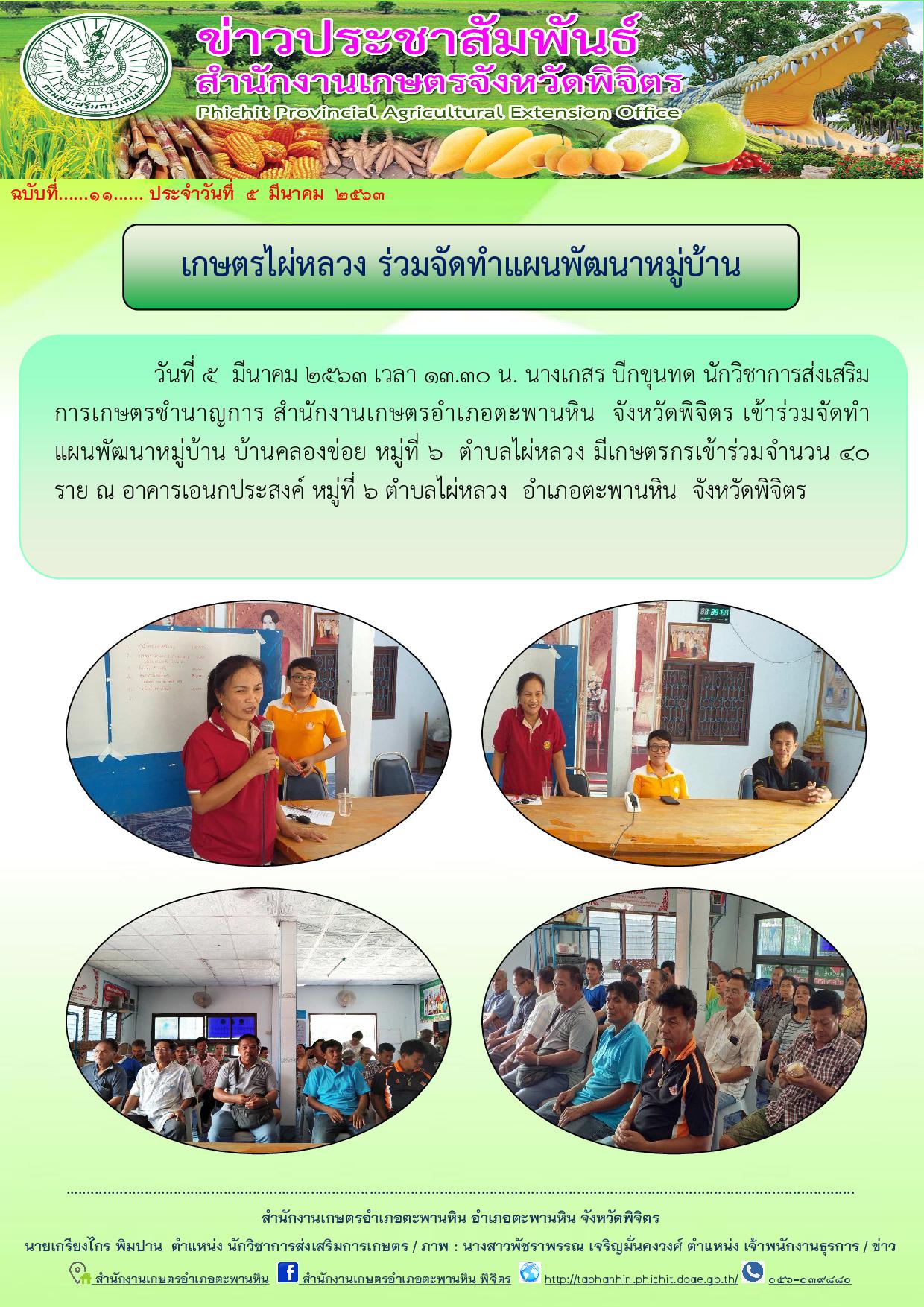 วันที่ 5 มีนาคม 2563 เวลา 13.30 น. นางเกสร บีกขุนทด นักวิชาการส่งเสริมการเกษตรชำนาญการ สำนักงานเกษตรอำเภอตะพานหิน จังหวัดพิจิตร เข้าร่วมจัดทำแผนพัฒนาหมู่บ้าน บ้านคลองข่อย หมู่ที่ 6 ตำบลไผ่หลวง มีเกษตรกรเข้าร่วมจำนวน 40 ราย ณ อาคารเอนกประสงค์ หมู่ที่ 6 ตำบลไผ่หลวง อำเภอตะพานหิน จังหวัดพิจิตร