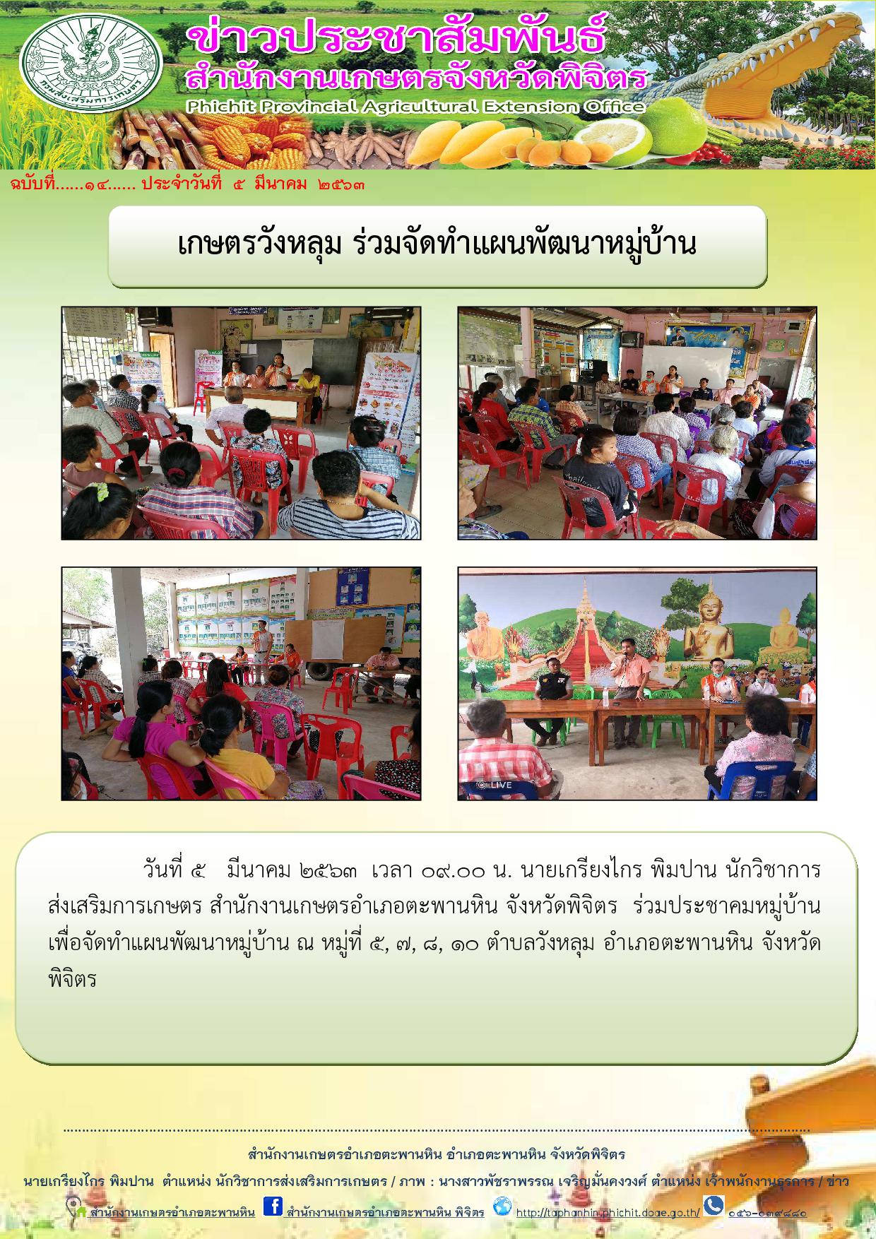 วันที่ 5 มีนาคม 2563 เวลา 09.00 น. นายเกรียงไกร พิมปาน นักวิชาการส่งเสริมการเกษตร สำนักงานเกษตรอำเภอตะพานหิน จังหวัดพิจิตร ร่วมประชาคมหมู่บ้าน เพื่อจัดทำแผนพัฒนาหมู่บ้าน ณ หมู่ที่ 5, 7, 8, 10 ตำบลวังหลุม อำเภอตะพานหิน จังหวัดพิจิตร