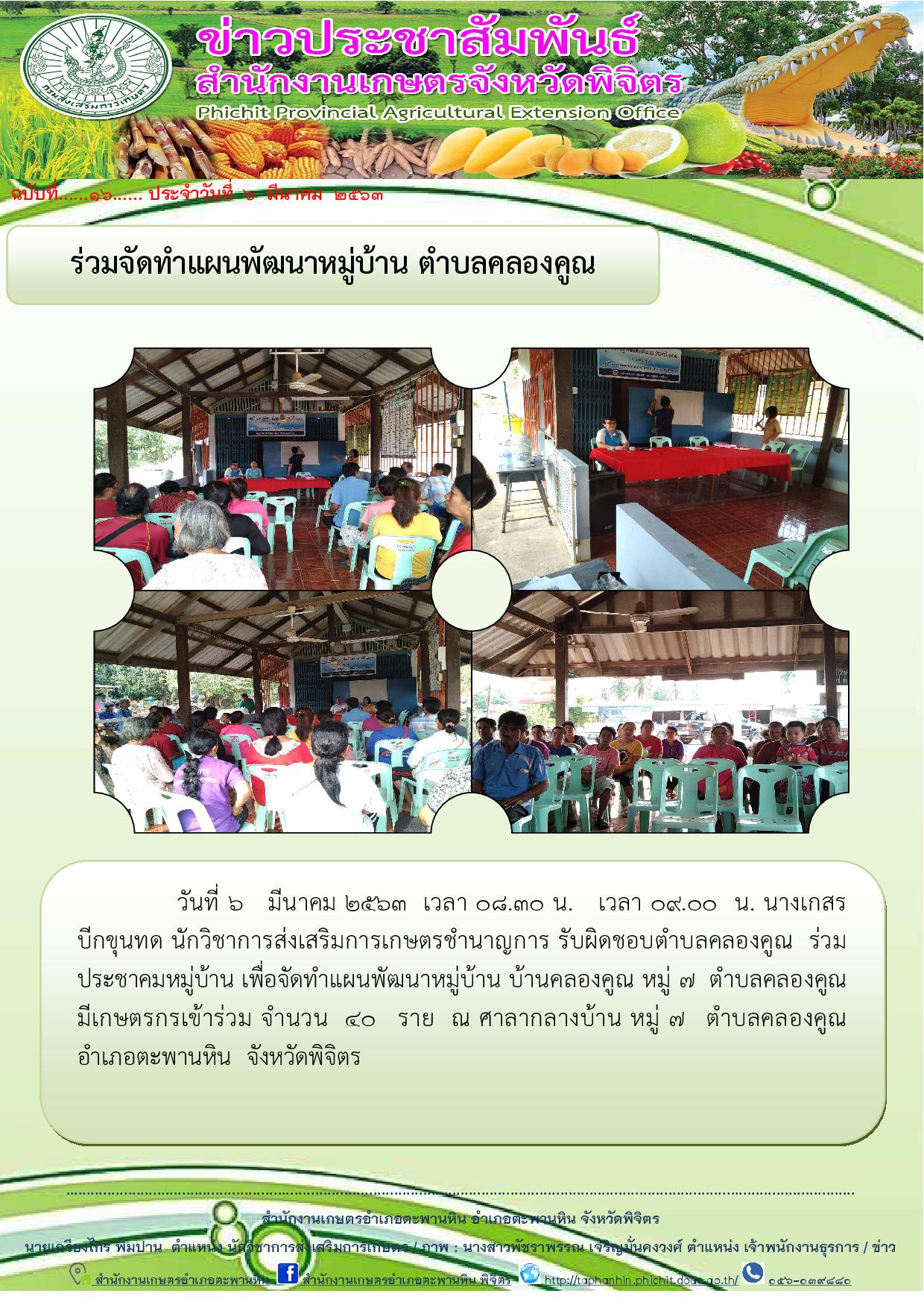 วันที่ 6 มีนาคม 2563 เวลา 08.30 น. เวลา 09.00 น. นางเกสร บีกขุนทด นักวิชาการส่งเสริมการเกษตรชำนาญการ รับผิดชอบตำบลคลองคูณ ร่วมประชาคมหมู่บ้าน เพื่อจัดทำแผนพัฒนาหมู่บ้าน บ้านคลองคูณ หมู่ 7 ตำบลคลองคูณ มีเกษตรกรเข้าร่วม จำนวน 40 ราย ณ ศาลากลางบ้าน หมู่ 7 ตำบลคลองคูณ อำเภอตะพานหิน จังหวัดพิจิตร