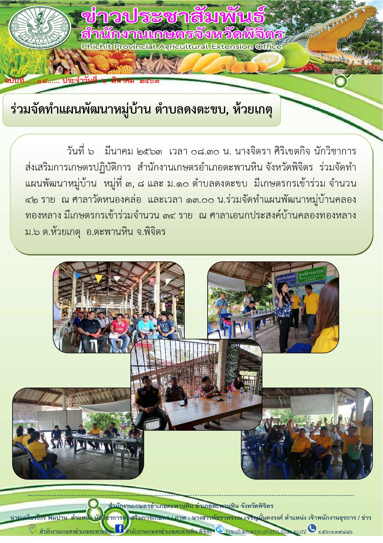 วันที่ 6 มีนาคม 2563 เวลา 08.30 น. นางจิตรา ศิริเขตกิจ นักวิชาการส่งเสริมการเกษตรปฏิบัติการ สำนักงานเกษตรอำเภอตะพานหิน จังหวัดพิจิตร ร่วมจัดทำแผนพัฒนาหมู่บ้าน หมู่ที่ 3, 8 และ ม.10 ตำบลดงตะขบ มีเกษตรกรเข้าร่วม จำนวน 42 ราย ณ ศาลาวัดหนองคล่อ และเวลา 13.00 น.ร่วมจัดทำแผนพัฒนาหมู่บ้านคลองทองหลาง มีเกษตรกรเข้าร่วมจำนวน 34 ราย ณ ศาลาเอนกประสงค์บ้านคลองทองหลางม.6 ต.ห้วยเกตุ อ.ตะพานหิน จ.พิจิตร