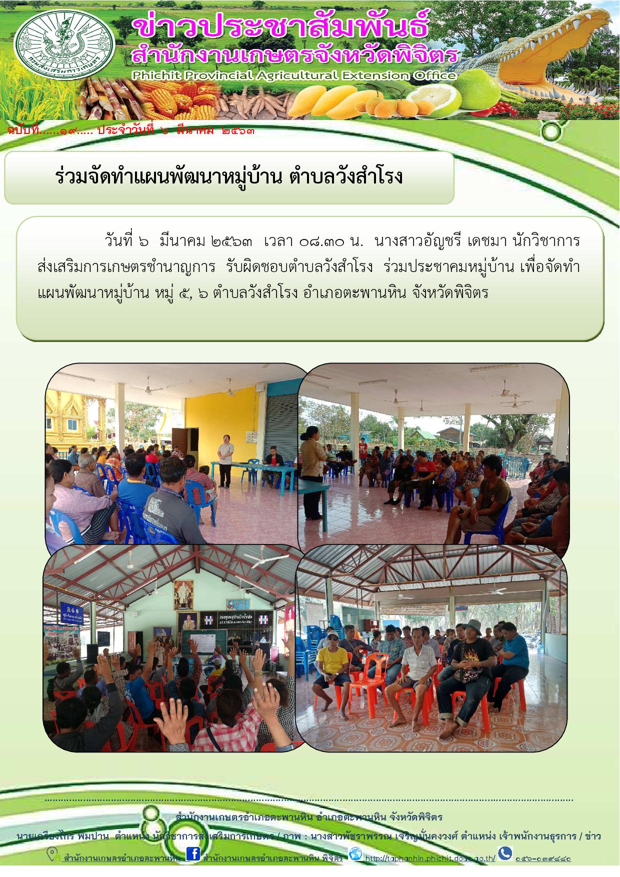 วันที่ 6 มีนาคม 2563 เวลา 08.30 น. นางสาวอัญชรี เดชมา นักวิชาการส่งเสริมการเกษตรชำนาญการ รับผิดชอบตำบลวังสำโรง ร่วมประชาคมหมู่บ้าน เพื่อจัดทำแผนพัฒนาหมู่บ้าน หมู่ 5, 6 ตำบลวังสำโรง อำเภอตะพานหิน จังหวัดพิจิตร