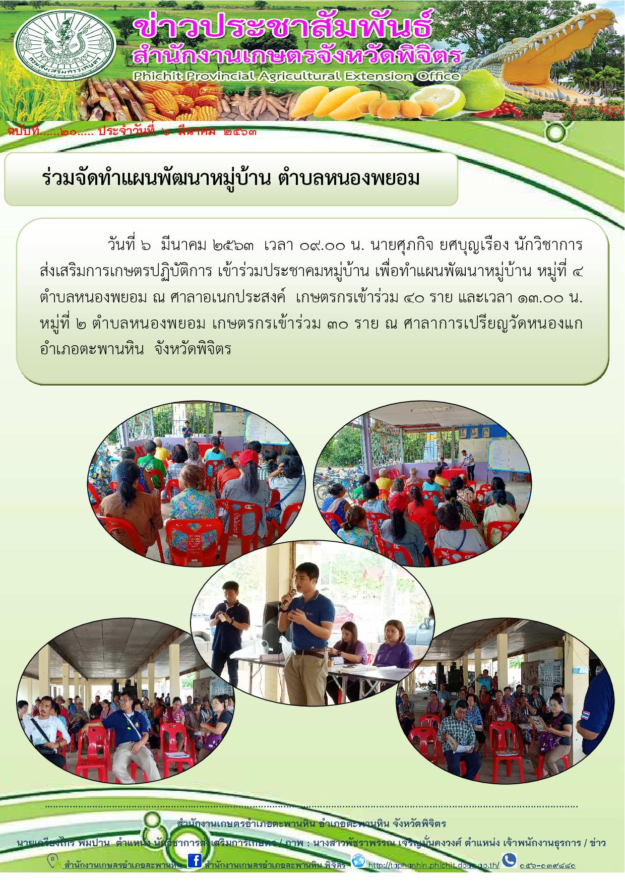 วันที่ 6 มีนาคม 2563 เวลา 09.00 น. นายศุภกิจ ยศบุญเรือง นักวิชาการส่งเสริมการเกษตรปฏิบัติการ เข้าร่วมประชาคมหมู่บ้าน เพื่อทำแผนพัฒนาหมู่บ้าน หมู่ที่ 4 ตำบลหนองพยอม ณ ศาลาอเนกประสงค์ เกษตรกรเข้าร่วม 40 ราย และเวลา 13.00 น. หมู่ที่ 2 ตำบลหนองพยอม เกษตรกรเข้าร่วม 30 ราย ณ ศาลาการเปรียญวัดหนองแก อำเภอตะพานหิน จังหวัดพิจิตร