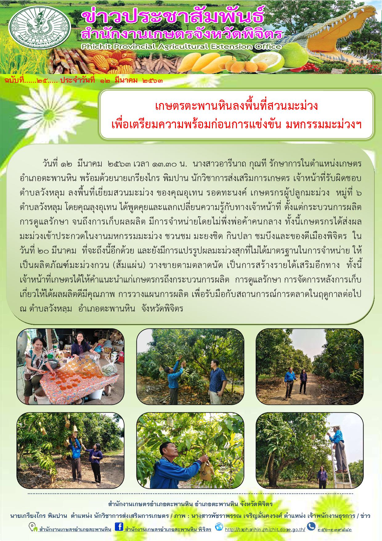 วันที่ 12 มีนาคม 2563 เวลา 13.30 น. นางสาวอารีนาถ กุณที รักษาการในตำแหน่งเกษตรอำเภอตะพานหิน พร้อมด้วยนายเกรียงไกร พิมปาน นักวิชาการส่งเสริมการเกษตร เจ้าหน้าที่รับผิดชอบตำบลวังหลุม ลงพื้นที่เยี่ยมสวนมะม่วง ของคุณอุเทน รอดทะนงค์ เกษตรกรผู้ปลูกมะม่วง หมู่ที่ 6 ตำบลวังหลุม โดยคุณลุงอุเทน ได้พูดคุยและแลกเปลี่ยนความรู้กับทางเจ้าหน้าที่ ตั้งแต่กระบวนการผลิต การดูแลรักษา จนถึงการเก็บผลผลิต มีการจำหน่ายโดยไม่พึ่งพ่อค้าคนกลาง ทั้งนี้เกษตรกรได้ส่งผลมะม่วงเข้าประกวดในงานมหกรรมมะม่วง ชวนชม มะยงชิด กินปลา ชมบึงและของดีเมืองพิจิตร ในวันที่ 20 มีนาคม ที่จะถึงนี้อีกด้วย และยังมีการแปรรูปผลมะม่วงสุกที่ไม่ได้มาตรฐานในการจำหน่าย ให้เป็นผลิตภัณฑ์มะม่วงกวน (ส้มแผ่น) วางขายตามตลาดนัด เป็นการสร้างรายได้เสริมอีกทาง ทั้งนี้เจ้าหน้าที่เกษตรได้ให้คำแนะนำแก่เกษตรกรถึงกระบวนการผลิต การดูแลรักษา การจัดการหลังการเก็บเกี่ยวให้ได้ผลผลิตดีมีคุณภาพ การวางแผนการผลิต เพื่อรับมือกับสถานการณ์การตลาดในฤดูกาลต่อไป ณ ตำบลวังหลุม อำเภอตะพานหิน จังหวัดพิจิตร
