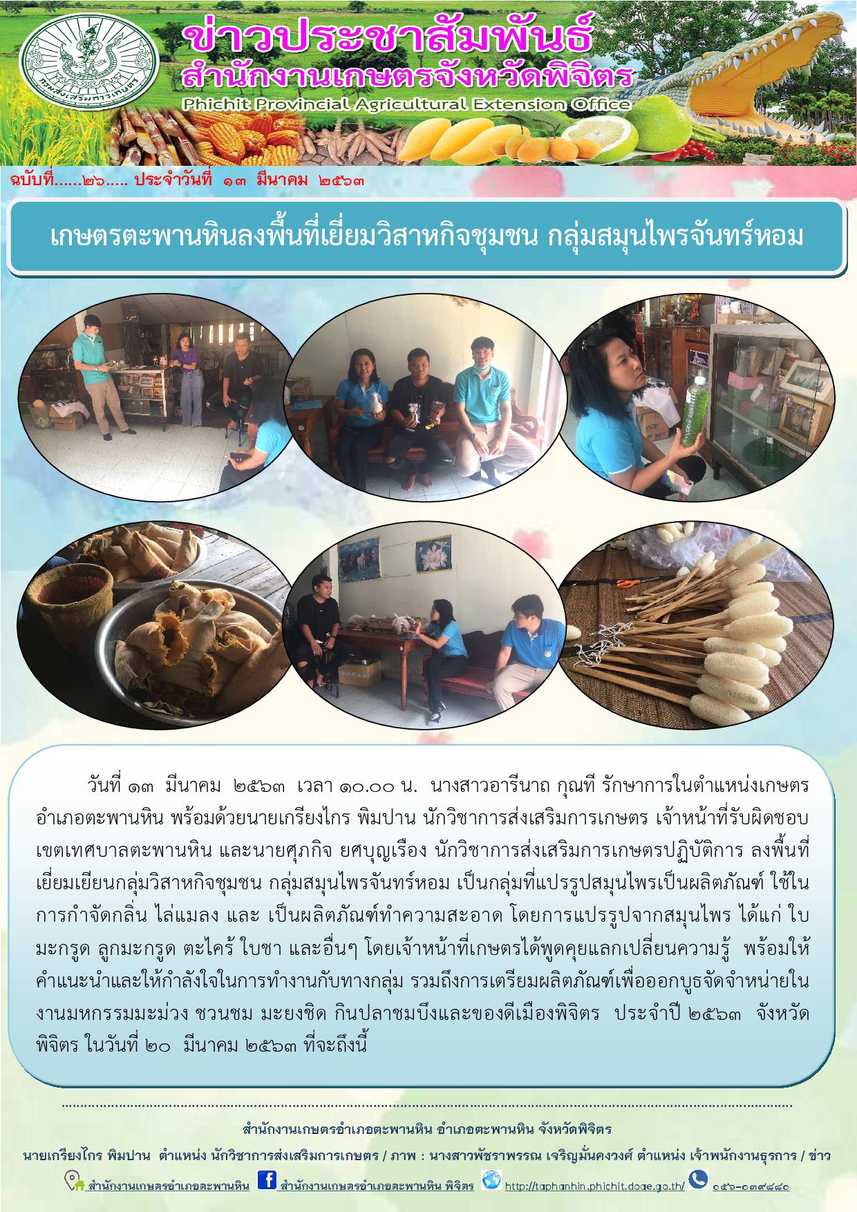 วันที่ 13 มีนาคม 2563 เวลา 10.00 น. นางสาวอารีนาถ กุณที รักษาการในตำแหน่งเกษตรอำเภอตะพานหิน พร้อมด้วยนายเกรียงไกร พิมปาน นักวิชาการส่งเสริมการเกษตร เจ้าหน้าที่รับผิดชอบเขตเทศบาลตะพานหิน และนายศุภกิจ ยศบุญเรือง นักวิชาการส่งเสริมการเกษตรปฏิบัติการ ลงพื้นที่เยี่ยมเยียนกลุ่มวิสาหกิจชุมชน กลุ่มสมุนไพรจันทร์หอม เป็นกลุ่มที่แปรรูปสมุนไพรเป็นผลิตภัณฑ์ ใช้ในการกำจัดกลิ่น ไล่แมลง และ เป็นผลิตภัณฑ์ทำความสะอาด โดยการแปรรูปจากสมุนไพร ได้แก่ ใบมะกรูด ลูกมะกรูด ตะไคร้ ใบชา และอื่นๆ โดยเจ้าหน้าที่เกษตรได้พูดคุยแลกเปลี่ยนความรู้ พร้อมให้คำแนะนำและให้กำลังใจในการทำงานกับทางกลุ่ม รวมถึงการเตรียมผลิตภัณฑ์เพื่อออกบูธจัดจำหน่ายในงานมหกรรมมะม่วง ชวนชม มะยงชิด กินปลาชมบึงและของดีเมืองพิจิตร ประจำปี 2563 จังหวัดพิจิตร ในวันที่ 20 มีนาคม 2563 ที่จะถึงนี้