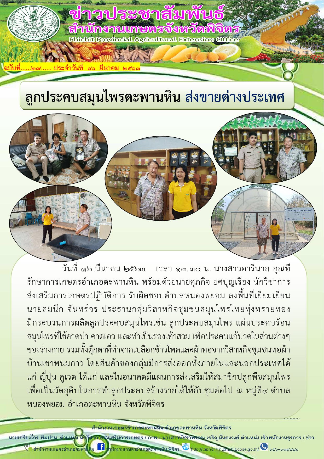 วันที่ 16 มีนาคม 2563 เวลา 13.30 น. นางสาวอารีนาถ กุณที รักษาการเกษตรอำเภอตะพานหิน พร้อมด้วยนายศุภกิจ ยศบุญเรือง นักวิชาการส่งเสริมการเกษตรปฏิบัติการ รับผิดชอบตำบลหนองพยอม ลงพื้นที่เยี่ยมเยียน นายสมนึก จันทร์จร ประธานกลุ่มวิสาหกิจชุมชนสมุนไพรไทยทุ่งทรายทอง มีกระบวนการผลิตลูกประคบสมุนไพรเช่น ลูกประคบสมุนไพร แผ่นประคบร้อนสมุนไพรที่ใช้คาดบ่า คาดเอว และทำเป็นรองเท้าสวม เพื่อประคบแก้ปวดในส่วนต่างๆ ของร่างกาย รวมทั้งตุ๊กตาที่ทำจากเปลือกข้าวโพดและผ้าทอจากวิสาหกิจชุมชนทอผ้าบ้านเขาพนมกาว โดยสินค้าของกลุ่มมีการส่งออกทั้งภายในและนอกประเทศได้ แก่ ญี่ปุ่น คูเวต ได้แก่ และในอนาคตมีแผนการส่งเสริมให้สมาชิกปลูกพืชสมุนไพร เพื่อเป็นวัตถุดิบในการทำลูกประคบสร้างรายได้ให้กับชุมต่อไป ณ หมู่ที่9 ตำบล หนองพยอม อำเภอตะพานหิน จังหวัดพิจิตร