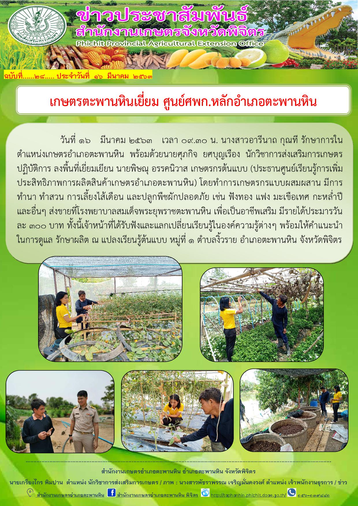 วันที่ 16 มีนาคม 2563 เวลา 09.30 น. นางสาวอารีนาถ กุณที รักษาการในตำแหน่งเกษตรอำเภอตะพานหิน พร้อมด้วยนายศุภกิจ ยศบุญเรือง นักวิชาการส่งเสริมการเกษตรปฏิบัติการ ลงพื้นที่เยี่ยมเยียน นายพิษณุ อรรคนิวาส เกษตรกรต้นแบบ (ประธานศูนย์เรียนรู้การเพิ่มประสิทธิภาพการผลิตสินค้าเกษตรอำเภอตะพานหิน) โดยทำการเกษตรกรแบบผสมผสาน มีการ ทำนา ทำสวน การเลี้ยงไส้เดือน และปลูกพืชผักปลอดภัย เช่น ฟังทอง แฟง มะเขือเทศ กะหล่ำปี และอื่นๆ ส่งขายที่โรงพยาบาลสมเด็จพระยุพราชตะพานหิน เพื่อเป็นอาชีพเสริม มีรายได้ประมารวันละ 300 บาท ทั้งนี้เจ้าหน้าที่ได้รับฟังและแลกเปลี่ยนเรียนรู้ในองค์ความรู้ต่างๆ พร้อมให้คำแนะนำ ในการดูแล รักษาผลิต ณ แปลงเรียนรู้ต้นแบบ หมู่ที่ 1 ตำบลงิ้วราย อำเภอตะพานหิน จังหวัดพิจิตร