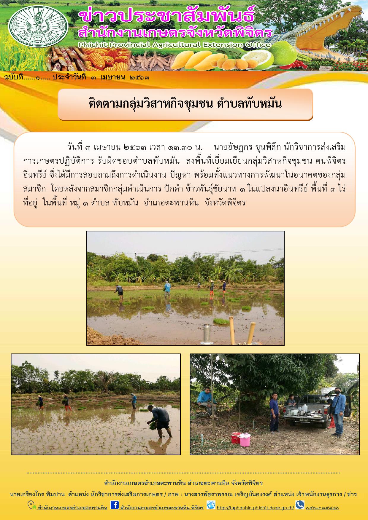 วันที่ 3 เมษายน 2563 เวลา 13.30 น. นายอัษฎกร ขุนพิลึก นักวิชาการส่งเสริมการเกษตรปฏิบัติการ รับผิดชอบตำบลทับหมัน ลงพื้นที่เยี่ยมเยียนกลุ่มวิสาหกิจชุมชน ฅนพิจิตรอินทรีย์ ซึ่งได้มีการสอบถามถึงการดำเนินงาน ปัญหา พร้อมทั้งแนวทางการพัฒนาในอนาคตของกลุ่มสมาชิก โดยหลังจากสมาชิกกลุ่มดำเนินการ ปักดำ ข้าวพันธุ์ชัยนาท 1 ในแปลงนาอินทรีย์ พื้นที่ 3 ไร่ ที่อยู่ ในพื้นที่ หมู่ 1 ตำบล ทับหมัน อำเภอตะพานหิน จังหวัดพิจิตร