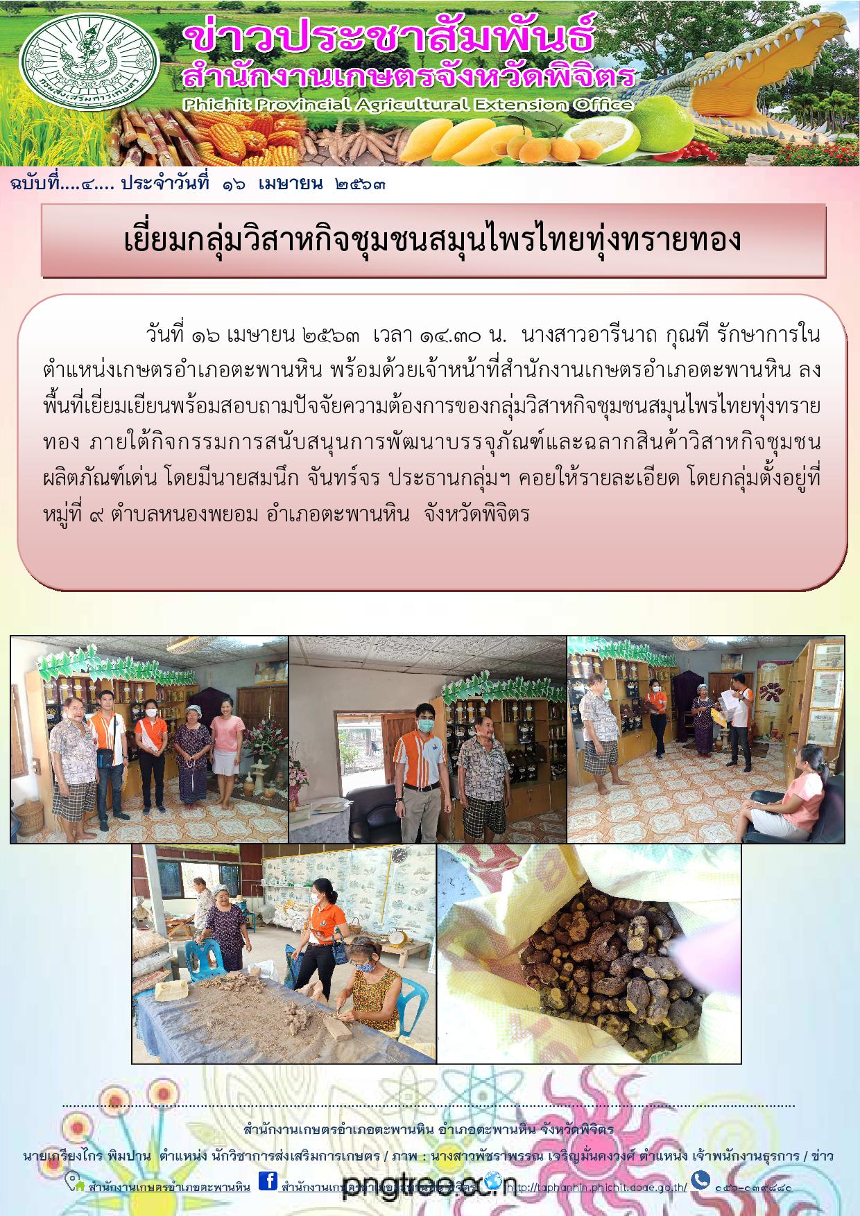 วันที่ 16 เมษายน 2563 เวลา 14.30 น. นางสาวอารีนาถ กุณที รักษาการในตำแหน่งเกษตรอำเภอตะพานหิน พร้อมด้วยเจ้าหน้าที่สำนักงานเกษตรอำเภอตะพานหิน ลงพื้นที่เยี่ยมเยียนพร้อมสอบถามปัจจัยความต้องการของกลุ่มวิสาหกิจชุมชนสมุนไพรไทยทุ่งทรายทอง ภายใต้กิจกรรมการสนับสนุนการพัฒนาบรรจุภัณฑ์และฉลากสินค้าวิสาหกิจชุมชนผลิตภัณฑ์เด่น โดยมีนายสมนึก จันทร์จร ประธานกลุ่มฯ คอยให้รายละเอียด โดยกลุ่มตั้งอยู่ที่หมู่ที่ 9 ตำบลหนองพยอม อำเภอตะพานหิน จังหวัดพิจิตร