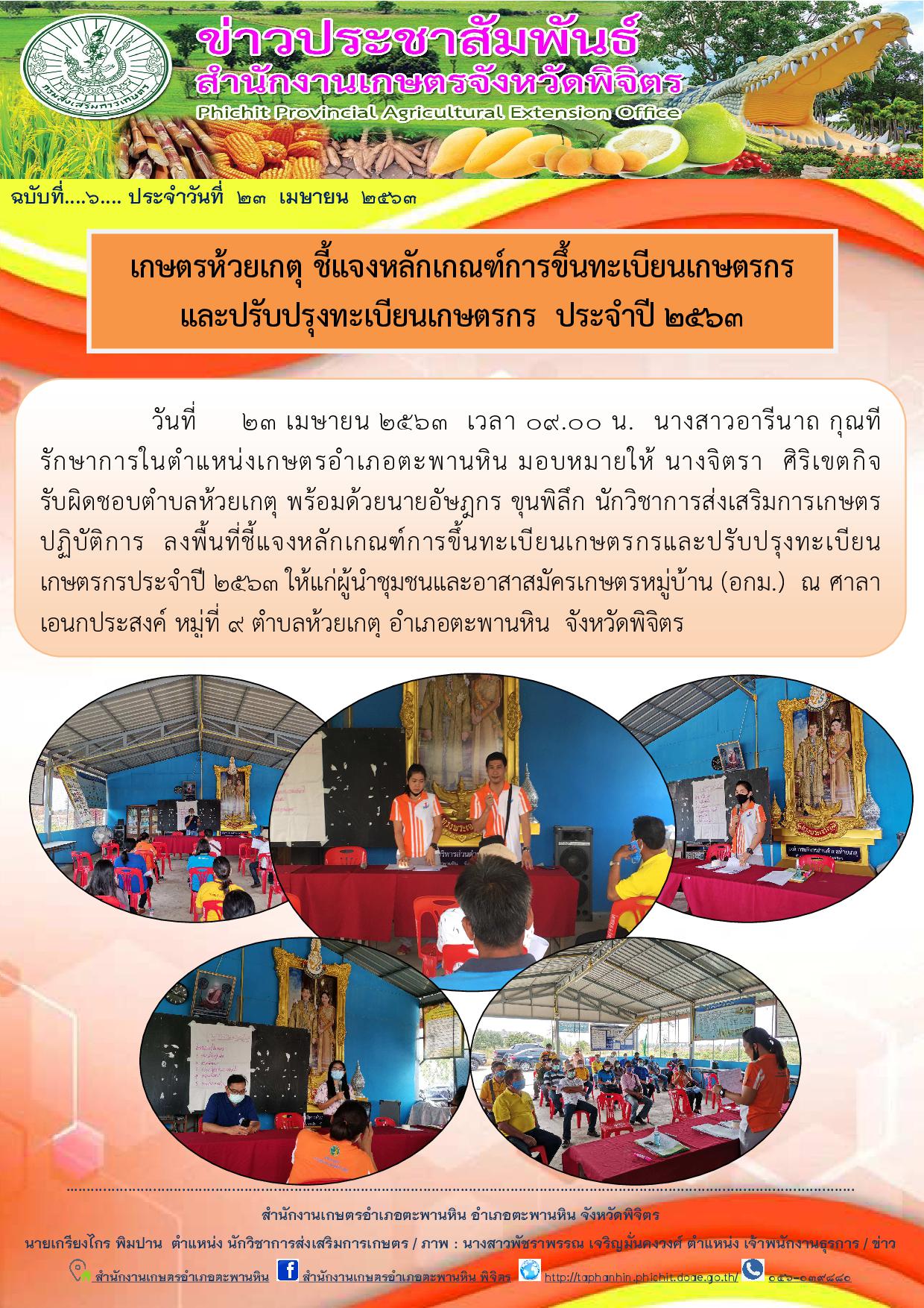 วันที่ 23 เมษายน 2563 เวลา 09.00 น. นางสาวอารีนาถ กุณที รักษาการในตำแหน่งเกษตรอำเภอตะพานหิน มอบหมายให้ นางจิตรา ศิริเขตกิจ รับผิดชอบตำบลห้วยเกตุ พร้อมด้วยนายอัษฎกร ขุนพิลึก นักวิชาการส่งเสริมการเกษตรปฏิบัติการ ลงพื้นที่ชี้แจงหลักเกณฑ์การขึ้นทะเบียนเกษตรกรและปรับปรุงทะเบียนเกษตรกรประจำปี 2563 ให้แก่ผู้นำชุมชนและอาสาสมัครเกษตรหมู่บ้าน (อกม.) ณ ศาลาเอนกประสงค์ หมู่ที่ 9 ตำบลห้วยเกตุ อำเภอตะพานหิน จังหวัดพิจิตร