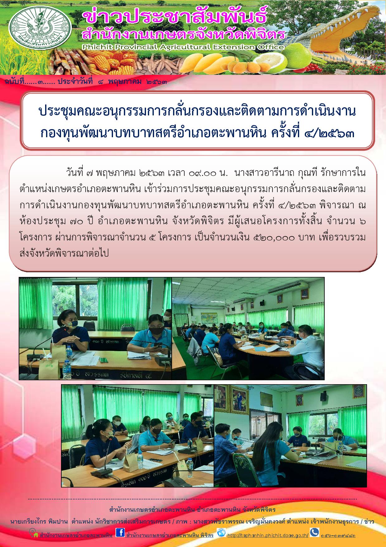 วันที่ 7 พฤษภาคม 2563 เวลา 09.00 น. นางสาวอารีนาถ กุณที รักษาการในตำแหน่งเกษตรอำเภอตะพานหิน เข้าร่วมการประชุมคณะอนุกรรมการกลั่นกรองและติดตามการดำเนินงานกองทุนพัฒนาบทบาทสตรีอำเภอตะพานหิน ครั้งที่ 4/2563 พิจารณา ณ ห้องประชุม 70 ปี อำเภอตะพานหิน จังหวัดพิจิตร มีผู้เสนอโครงการทั้งสิ้น จำนวน 6 โครงการ ผ่านการพิจารณาจำนวน 5 โครงการ เป็นจำนวนเงิน 520,000 บาท เพื่อรวบรวมส่งจังหวัดพิจารณาต่อไป
