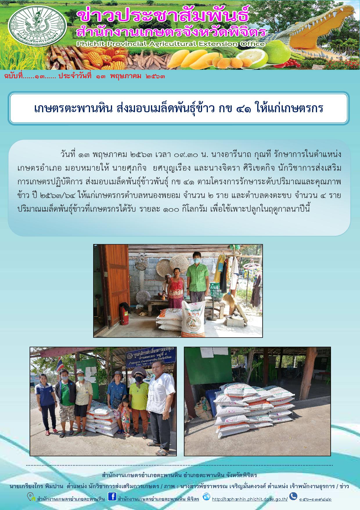 วันที่ 13 พฤษภาคม 2563 เวลา 09.30 น. นางอารีนาถ กุณที รักษาการในตำแหน่งเกษตรอำเภอ มอบหมายให้ นายศุภกิจ ยศบุญเรือง และนางจิตรา ศิริเขตกิจ นักวิชาการส่งเสริมการเกษตรปฏิบัติการ ส่งมอบเมล็ดพันธุ์ข้าวพันธุ์ กข 41 ตามโครงการรักษาระดับปริมาณและคุณภาพข้าว ปี 2563/64 ให้แก่เกษตรกรตำบลหนองพยอม จำนวน 2 ราย และตำบลดงตะขบ จำนวน 4 ราย ปริมาณเมล็ดพันธุ์ข้าวที่เกษตรกรได้รับ รายละ 100 กิโลกรัม เพื่อใช้เพาะปลูกในฤดูกาลนาปีนี้