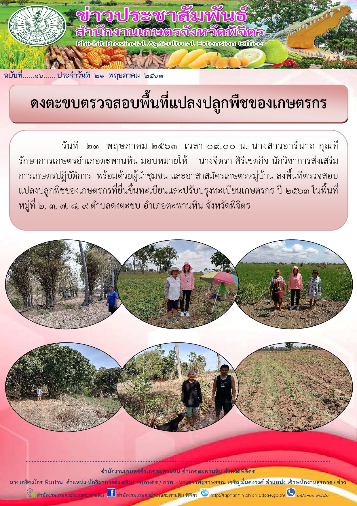 วันที่ 21 พฤษภาคม 2563 เวลา 09.00 น. นางสาวอารีนาถ กุณที รักษาการเกษตรอำเภอตะพานหิน มอบหมายให้ นางจิตรา ศิริเขตกิจ นักวิชาการส่งเสริมการเกษตรปฏิบัติการ พร้อมด้วยผู้นำชุมชน และอาสาสมัครเกษตรหมู่บ้าน ลงพื้นที่ตรวจสอบแปลงปลูกพืชของเกษตรกรที่ยื่นขึ้นทะเบียนและปรับปรุงทะเบียนเกษตรกร ปี 2563 ในพื้นที่หมู่ที่ 2, 3, 7, 8, 9 ตำบลดงตะขบ อำเภอตะพานหิน จังหวัดพิจิตร