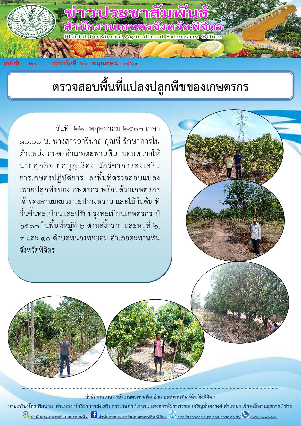 วันที่ 22 พฤษภาคม 2563 เวลา 10.00 น. นางสาวอารีนาถ กุณที รักษาการในตำแหน่งเกษตรอำเภอตะพานหิน มอบหมายให้นายศุภกิจ ยศบุญเรือง นักวิชาการส่งเสริมการเกษตรปฏิบัติการ ลงพื้นที่ตรวจสอบแปลงเพาะปลูกพืชของเกษตรกร พร้อมด้วยเกษตรกรเจ้าของสวนมะม่วง มะปรางหวาน และไม้ยืนต้น ที่ยื่นขึ้นทะเบียนและปรับปรุงทะเบียนเกษตรกร ปี 2563 ในพื้นที่หมู่ที่ 2 ตำบลงิ้วราย และหมู่ที่ 2, 9 และ 10 ตำบลหนองพะยอม อำเภอตะพานหิน จังหวัดพิจิตร