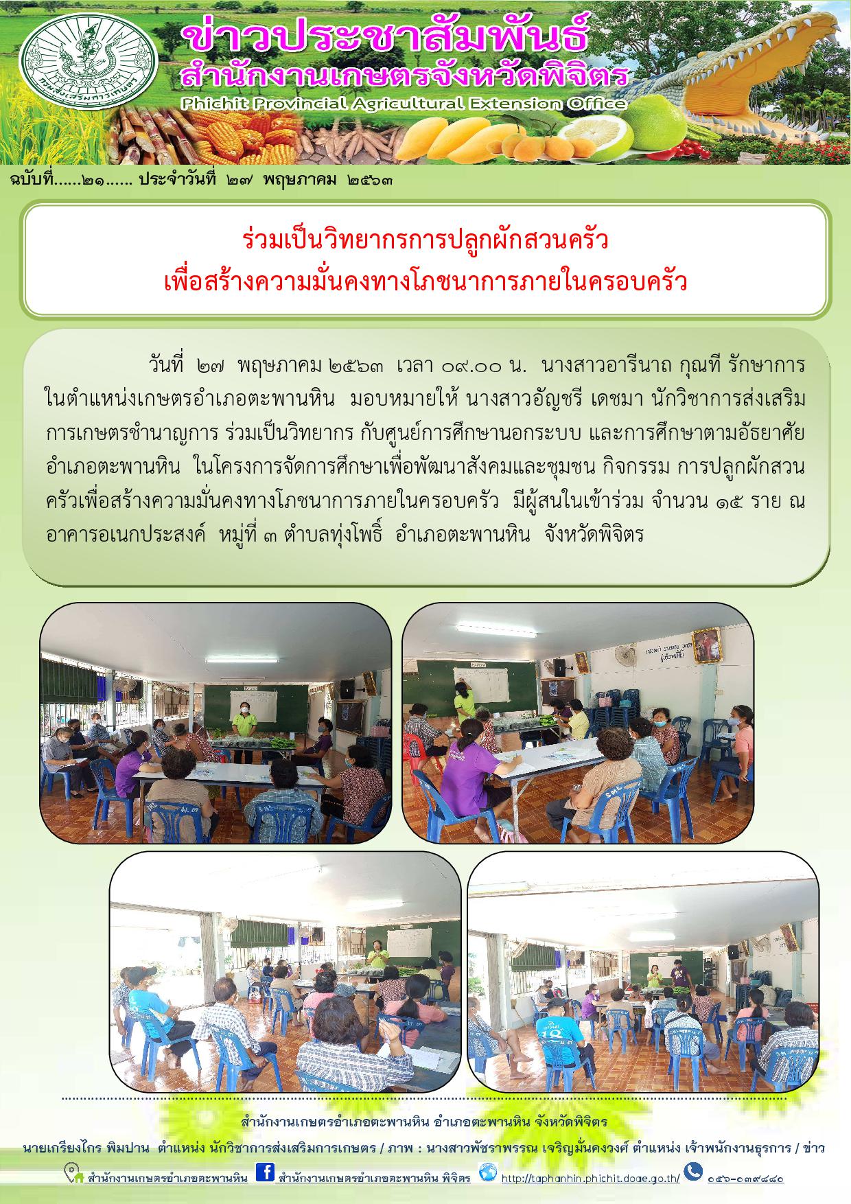 วันที่ 27 พฤษภาคม 2563 เวลา 09.00 น. นางสาวอารีนาถ กุณที รักษาการในตำแหน่งเกษตรอำเภอตะพานหิน มอบหมายให้ นางสาวอัญชรี เดชมา นักวิชาการส่งเสริมการเกษตรชำนาญการ ร่วมเป็นวิทยากร กับศูนย์การศึกษานอกระบบ และการศึกษาตามอัธยาศัยอำเภอตะพานหิน ในโครงการจัดการศึกษาเพื่อพัฒนาสังคมและชุมชน กิจกรรม การปลูกผักสวนครัวเพื่อสร้างความมั่นคงทางโภชนาการภายในครอบครัว มีผู้สนในเข้าร่วม จำนวน 15 ราย ณ อาคารอเนกประสงค์ หมู่ที่ 3 ตำบลทุ่งโพธิ์ อำเภอตะพานหิน จังหวัดพิจิตร