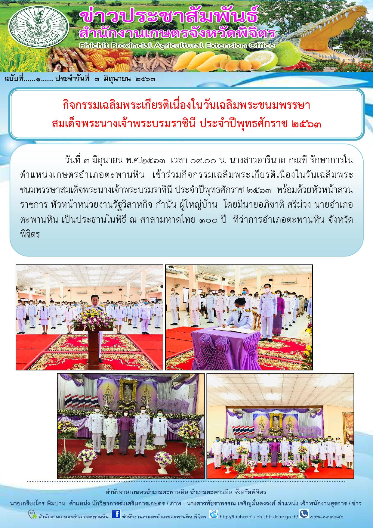วันที่ 3 มิถุนายน พ.ศ.2563 เวลา 09.00 น. นางสาวอารีนาถ กุณที รักษาการในตำแหน่งเกษตรอำเภอตะพานหิน เข้าร่วมกิจกรรมเฉลิมพระเกียรติเนื่องในวันเฉลิมพระชนมพรรษาสมเด็จพระนางเจ้าพระบรมราชินี ประจำปีพุทธศักราช 2563 พร้อมด้วยหัวหน้าส่วนราชการ หัวหน้าหน่วยงานรัฐวิสาหกิจ กำนัน ผู้ใหญ่บ้าน โดยมีนายอภิชาติ ศรีม่วง นายอำเภอตะพานหิน เป็นประธานในพิธี ณ ศาลามหาดไทย 100 ปี ที่ว่าการอำเภอตะพานหิน จังหวัดพิจิตร