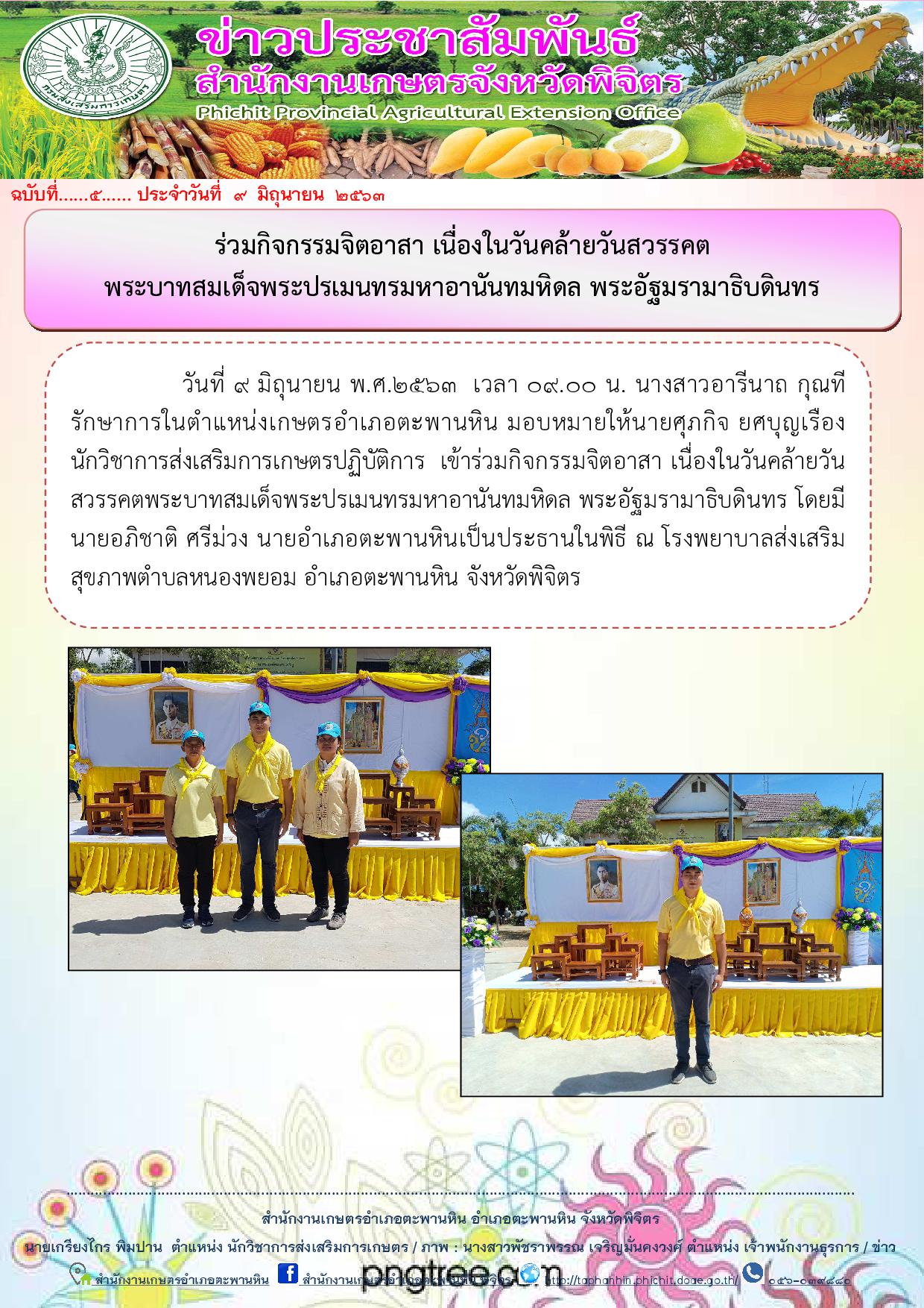 วันที่ 9 มิถุนายน พ.ศ.2563 เวลา 09.00 น. นางสาวอารีนาถ กุณที รักษาการในตำแหน่งเกษตรอำเภอตะพานหิน มอบหมายให้นายศุภกิจ ยศบุญเรือง นักวิชาการส่งเสริมการเกษตรปฏิบัติการ เข้าร่วมกิจกรรมจิตอาสา เนื่องในวันคล้ายวันสวรรคตพระบาทสมเด็จพระปรเมนทรมหาอานันทมหิดล พระอัฐมรามาธิบดินทร โดยมีนายอภิชาติ ศรีม่วง นายอำเภอตะพานหินเป็นประธานในพิธี ณ โรงพยาบาลส่งเสริมสุขภาพตำบลหนองพยอม อำเภอตะพานหิน จังหวัดพิจิตร