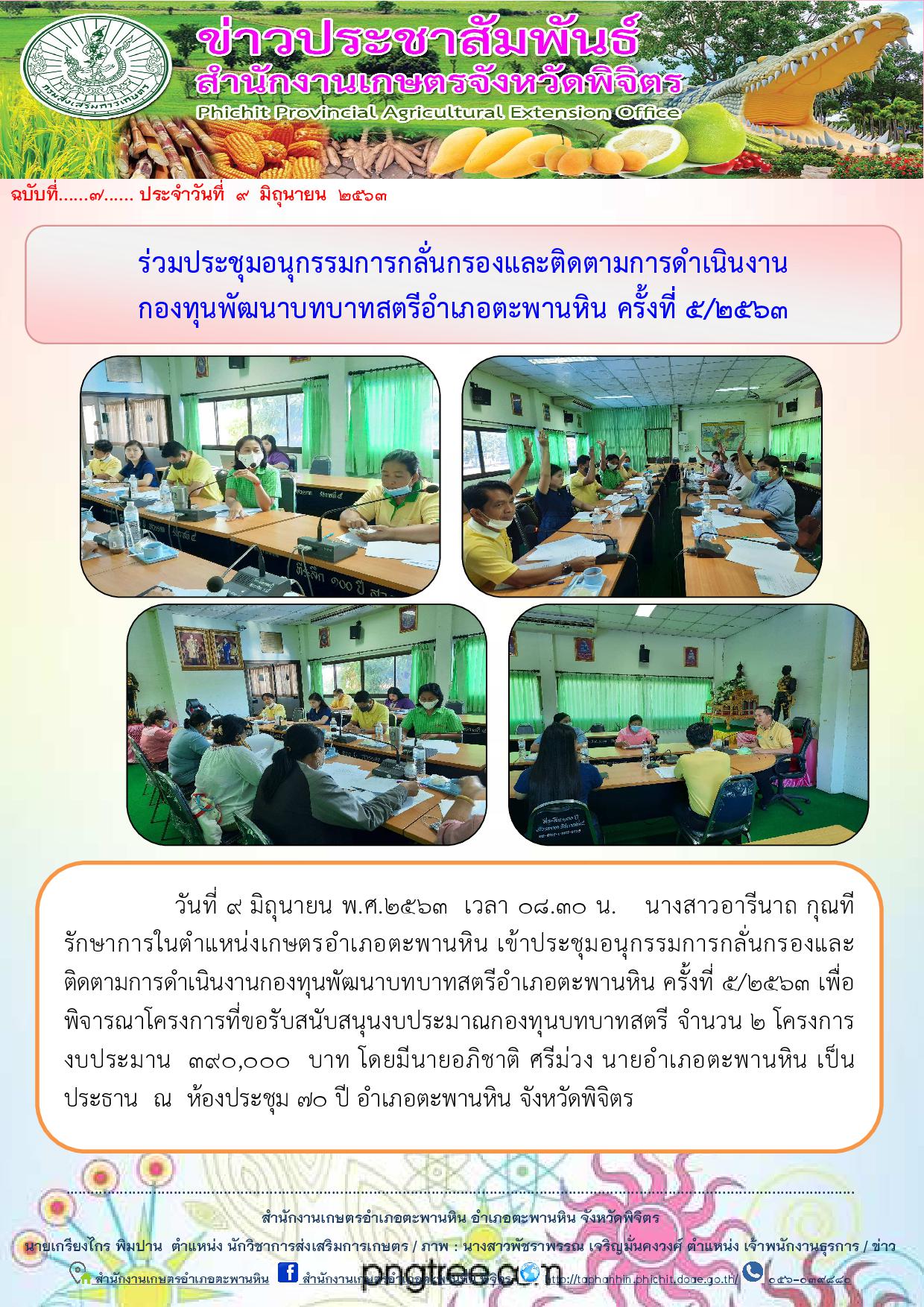 วันที่ 9 มิถุนายน พ.ศ.2563 เวลา 08.30 น. นางสาวอารีนาถ กุณที รักษาการในตำแหน่งเกษตรอำเภอตะพานหิน เข้าประชุมอนุกรรมการกลั่นกรองและติดตามการดำเนินงานกองทุนพัฒนาบทบาทสตรีอำเภอตะพานหิน ครั้งที่ 5/2563 เพื่อพิจารณาโครงการที่ขอรับสนับสนุนงบประมาณกองทุนบทบาทสตรี จำนวน 2 โครงการ งบประมาน 390,000 บาท โดยมีนายอภิชาติ ศรีม่วง นายอำเภอตะพานหิน เป็นประธาน ณ ห้องประชุม 70 ปี อำเภอตะพานหิน จังหวัดพิจิตร