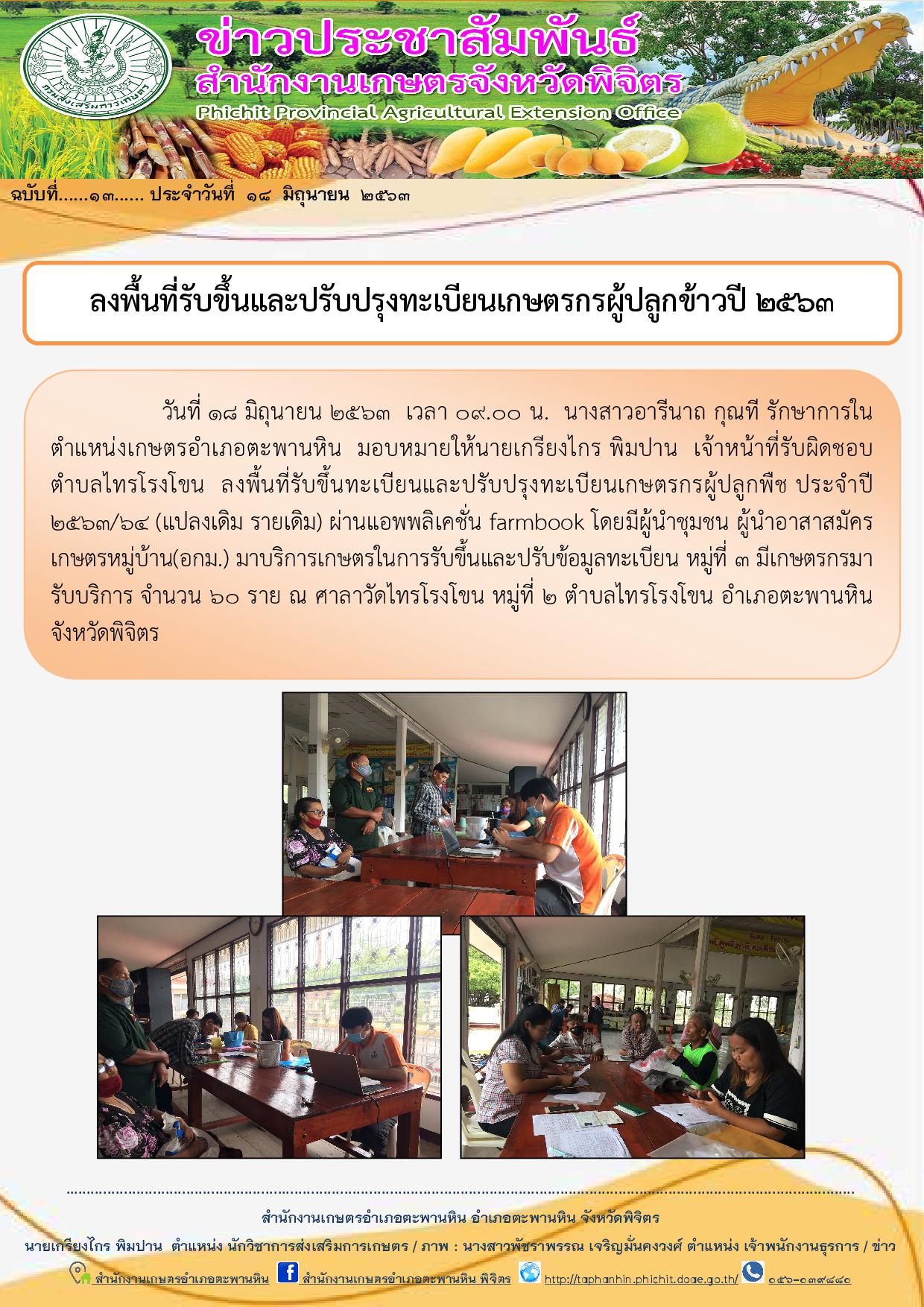 วันที่ 18 มิถุนายน 2563 เวลา 09.00 น. นางสาวอารีนาถ กุณที รักษาการในตำแหน่งเกษตรอำเภอตะพานหิน มอบหมายให้นายเกรียงไกร พิมปาน เจ้าหน้าที่รับผิดชอบตำบลไทรโรงโขน ลงพื้นที่รับขึ้นทะเบียนและปรับปรุงทะเบียนเกษตรกรผู้ปลูกพืช ประจำปี 2563/64 (แปลงเดิม รายเดิม) ผ่านแอพพลิเคชั่น farmbook โดยมีผู้นำชุมชน ผู้นำอาสาสมัครเกษตรหมู่บ้าน(อกม.) มาบริการเกษตรในการรับขึ้นและปรับข้อมูลทะเบียน หมู่ที่ 3 มีเกษตรกรมารับบริการ จำนวน 60 ราย ณ ศาลาวัดไทรโรงโขน หมู่ที่ 2 ตำบลไทรโรงโขน อำเภอตะพานหิน จังหวัดพิจิตร