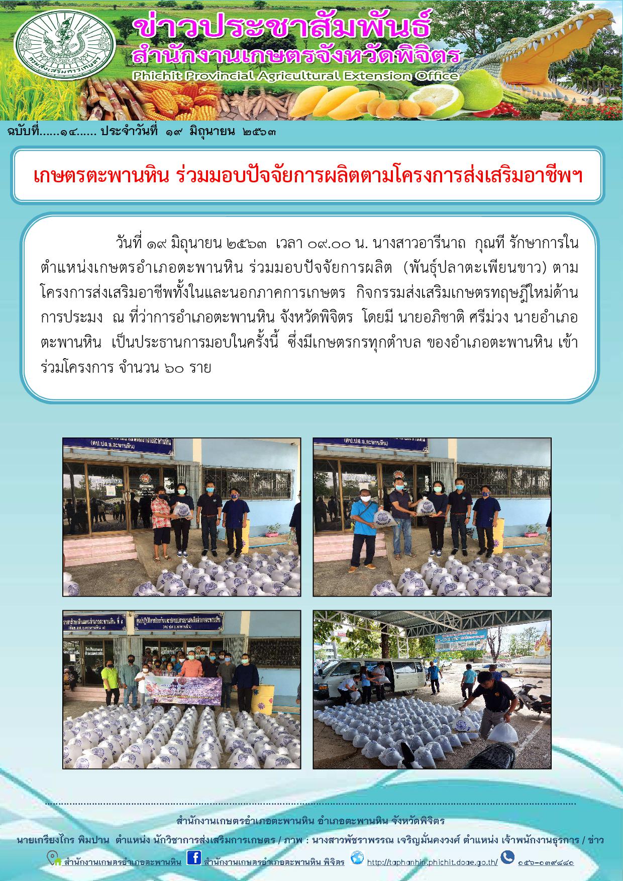 วันที่ 19 มิถุนายน 2563 เวลา 09.00 น. นางสาวอารีนาถ กุณที รักษาการในตำแหน่งเกษตรอำเภอตะพานหิน ร่วมมอบปัจจัยการผลิต (พันธุ์ปลาตะเพียนขาว) ตามโครงการส่งเสริมอาชีพทั้งในและนอกภาคการเกษตร กิจกรรมส่งเสริมเกษตรทฤษฎีใหม่ด้านการประมง ณ ที่ว่าการอำเภอตะพานหิน จังหวัดพิจิตร โดยมี นายอภิชาติ ศรีม่วง นายอำเภอตะพานหิน เป็นประธานการมอบในครั้งนี้ ซึ่งมีเกษตรกรทุกตำบล ของอำเภอตะพานหิน เข้าร่วมโครงการ จำนวน 60 ราย