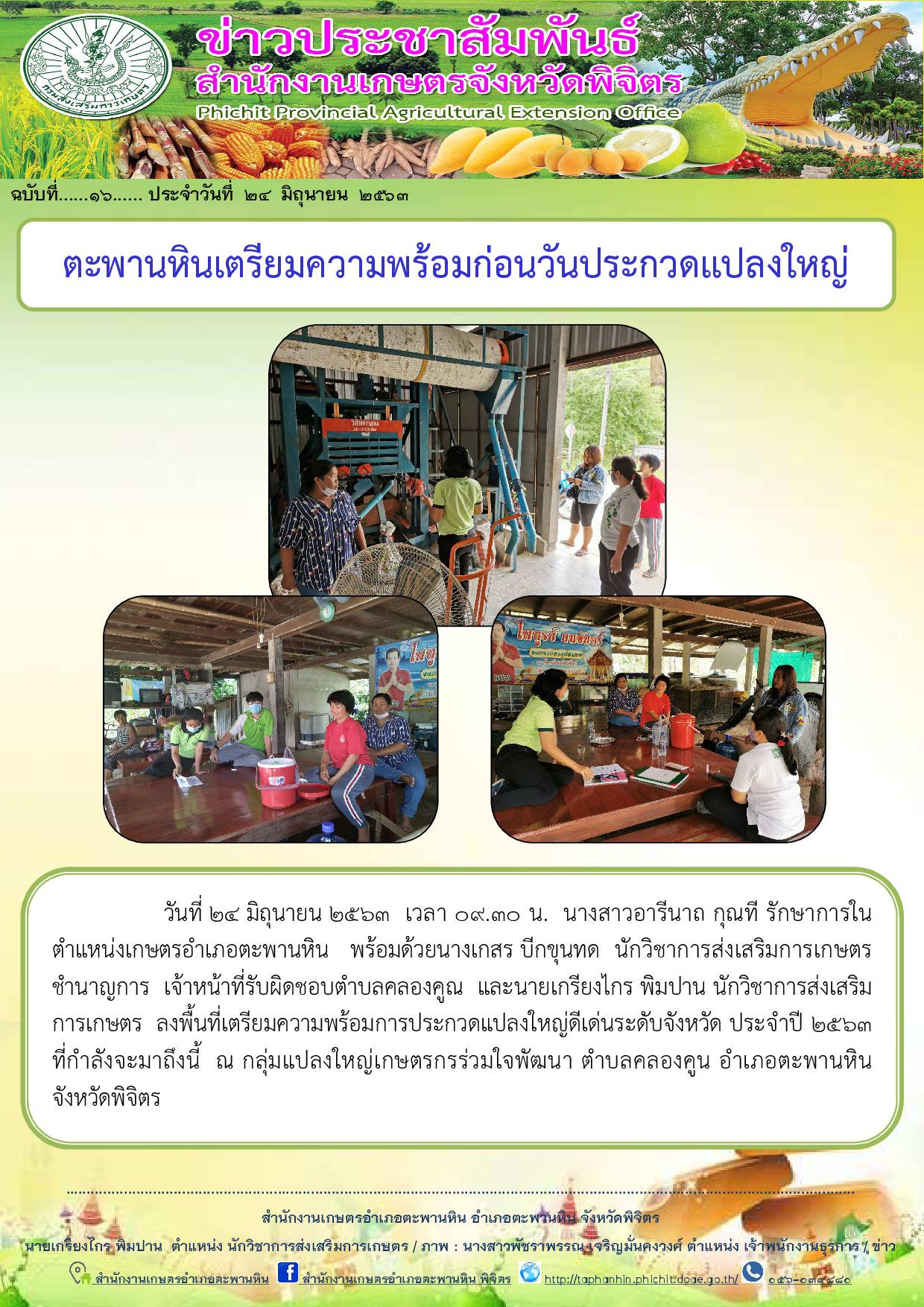 วันที่ 24 มิถุนายน 2563 เวลา 09.30 น. นางสาวอารีนาถ กุณที รักษาการในตำแหน่งเกษตรอำเภอตะพานหิน พร้อมด้วยนางเกสร บีกขุนทด นักวิชาการส่งเสริมการเกษตรชำนาญการ เจ้าหน้าที่รับผิดชอบตำบลคลองคูณ และนายเกรียงไกร พิมปาน นักวิชาการส่งเสริมการเกษตร ลงพื้นที่เตรียมความพร้อมการประกวดแปลงใหญ่ดีเด่นระดับจังหวัด ประจำปี 2563 ที่กำลังจะมาถึงนี้ ณ กลุ่มแปลงใหญ่เกษตรกรร่วมใจพัฒนา ตำบลคลองคูน อำเภอตะพานหิน จังหวัดพิจิตร