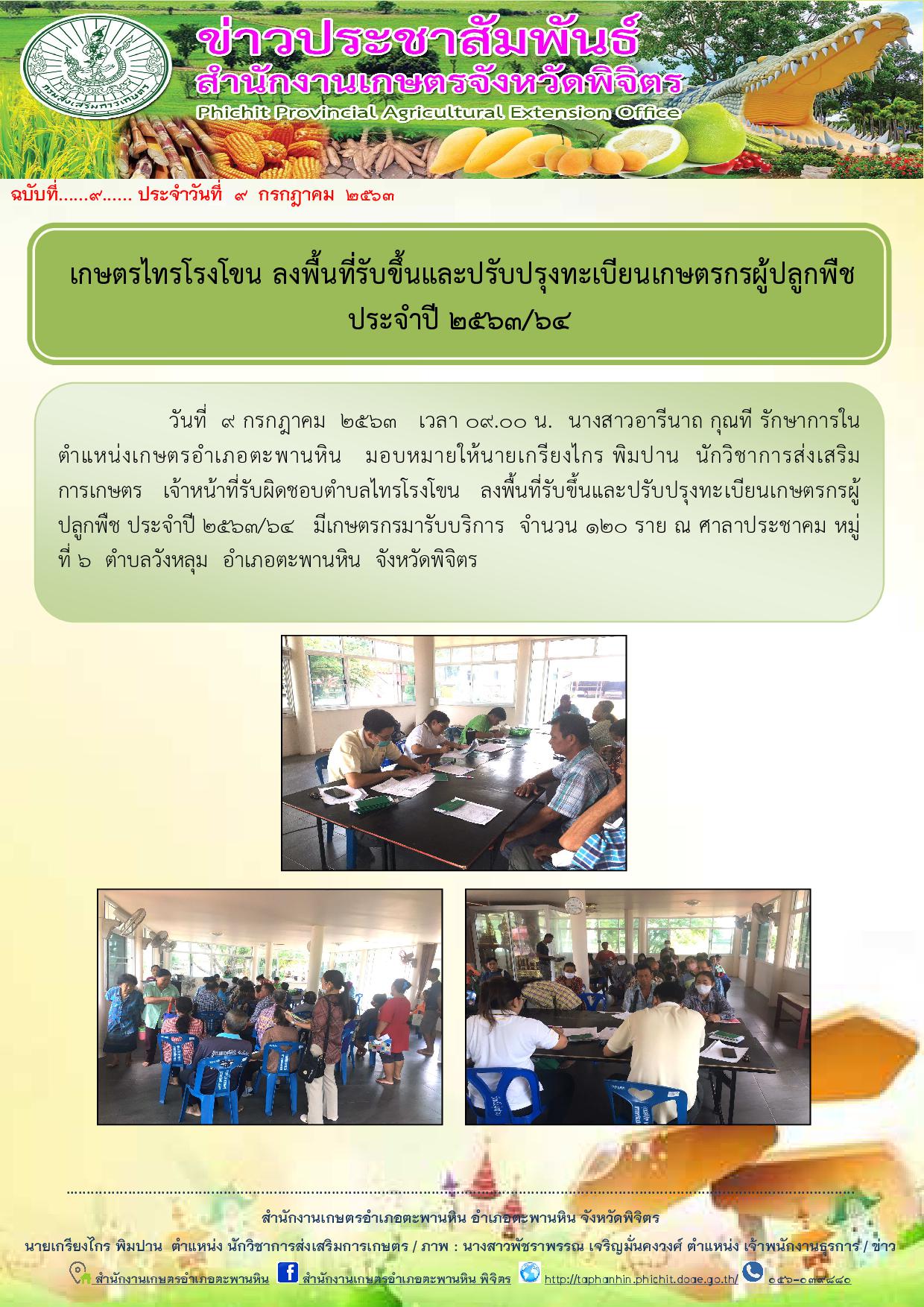 วันที่ 9 กรกฎาคม 2563 เวลา 09.00 น. นางสาวอารีนาถ กุณที รักษาการในตำแหน่งเกษตรอำเภอตะพานหิน มอบหมายให้นายเกรียงไกร พิมปาน นักวิชาการส่งเสริมการเกษตร เจ้าหน้าที่รับผิดชอบตำบลไทรโรงโขน ลงพื้นที่รับขึ้นและปรับปรุงทะเบียนเกษตรกรผู้ปลูกพืช ประจำปี 2563/64 มีเกษตรกรมารับบริการ จำนวน 120 ราย ณ ศาลาประชาคม หมู่ที่ 6 ตำบลวังหลุม อำเภอตะพานหิน จังหวัดพิจิตร