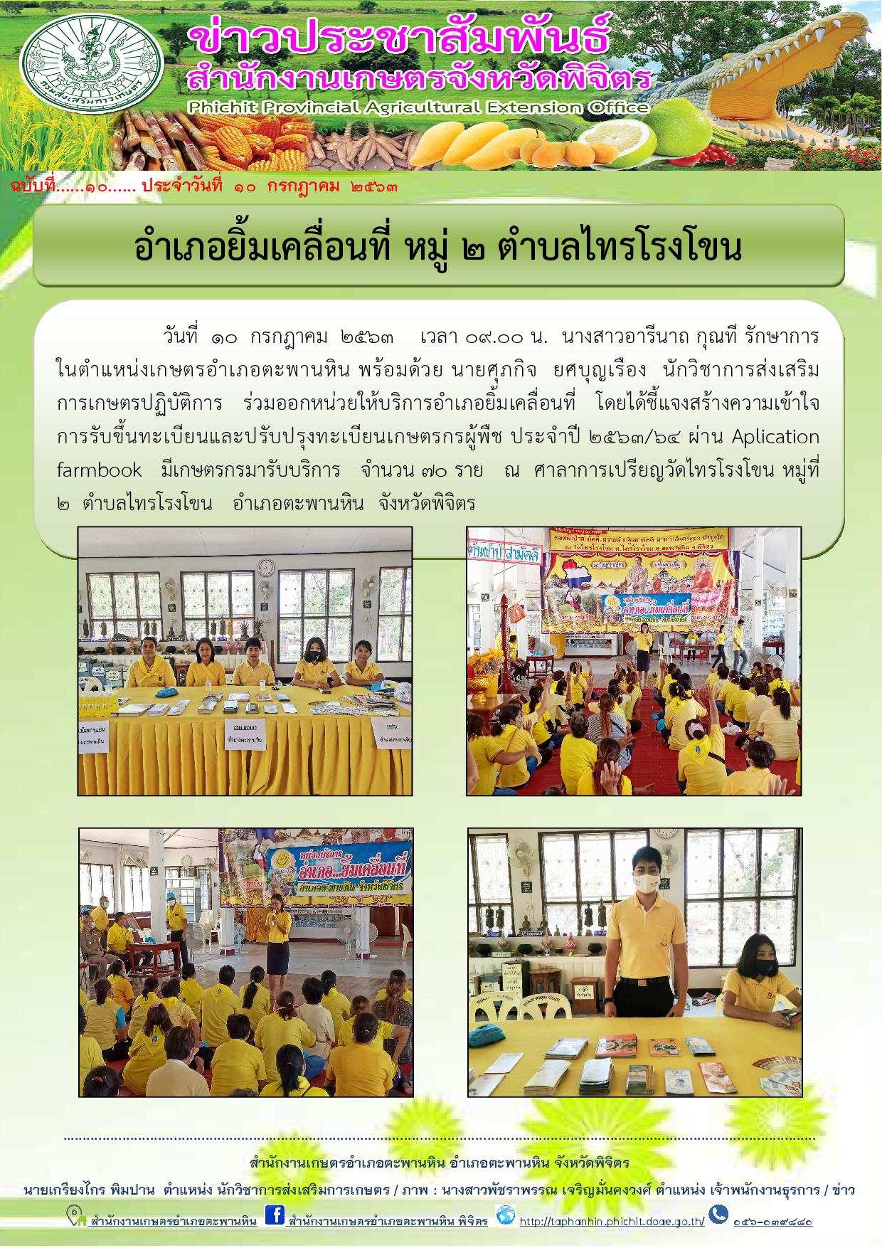 วันที่ 10 กรกฎาคม 2563 เวลา 09.00 น. นางสาวอารีนาถ กุณที รักษาการในตำแหน่งเกษตรอำเภอตะพานหิน พร้อมด้วย นายศุภกิจ ยศบุญเรือง นักวิชาการส่งเสริมการเกษตรปฏิบัติการ ร่วมออกหน่วยให้บริการอำเภอยิ้มเคลื่อนที่ โดยได้ชี้แจงสร้างความเข้าใจการรับขึ้นทะเบียนและปรับปรุงทะเบียนเกษตรกรผู้พืช ประจำปี 2563/64 ผ่าน Aplication farmbook มีเกษตรกรมารับบริการ จำนวน 70 ราย ณ ศาลาการเปรียญวัดไทรโรงโขน หมู่ที่ 2 ตำบลไทรโรงโขน อำเภอตะพานหิน จังหวัดพิจิตร