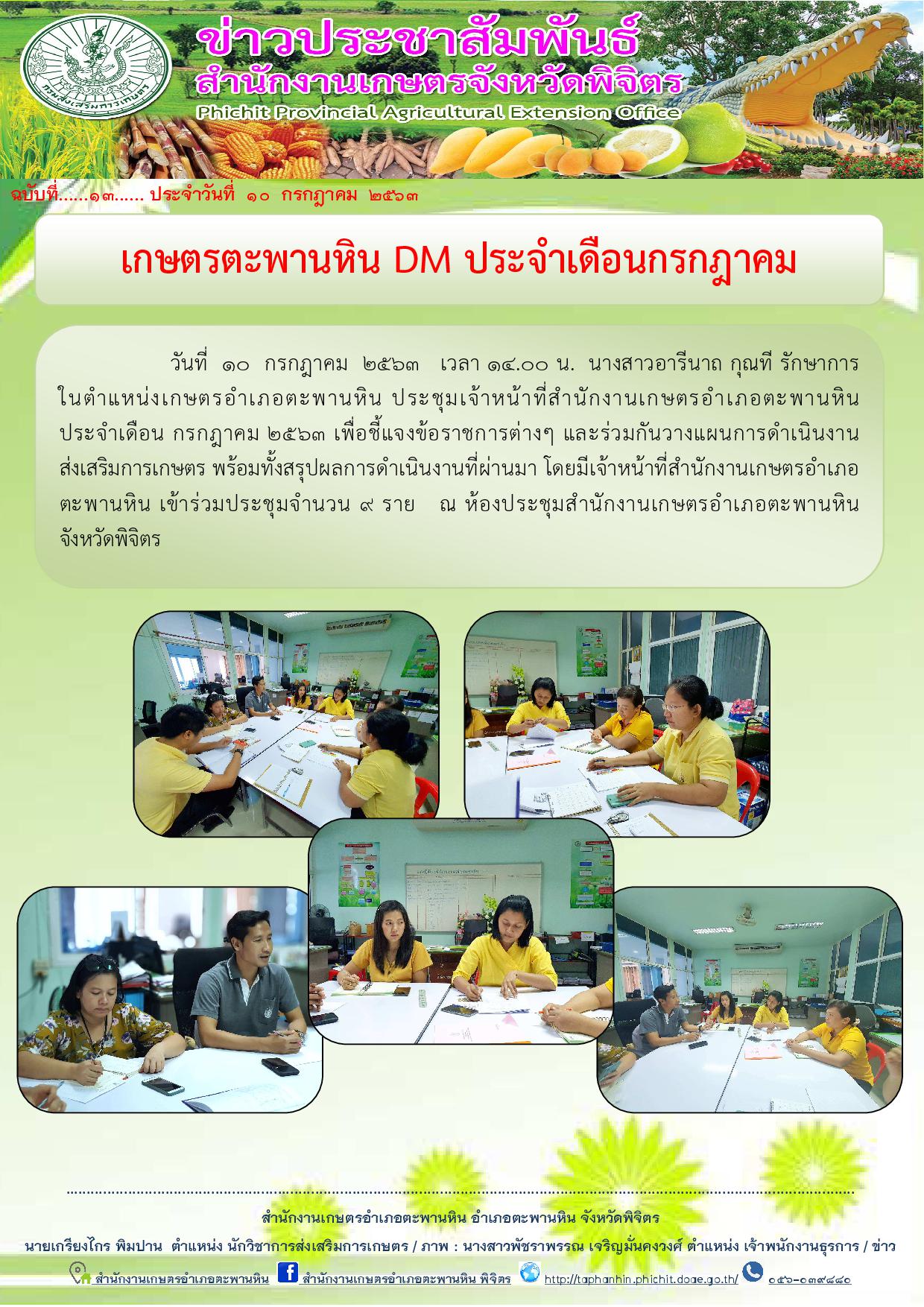 วันที่ 10 กรกฎาคม 2563 เวลา 14.00 น. นางสาวอารีนาถ กุณที รักษาการในตำแหน่งเกษตรอำเภอตะพานหิน ประชุมเจ้าหน้าที่สำนักงานเกษตรอำเภอตะพานหิน ประจำเดือน กรกฎาคม 2563 เพื่อชี้แจงข้อราชการต่างๆ และร่วมกันวางแผนการดำเนินงานส่งเสริมการเกษตร พร้อมทั้งสรุปผลการดำเนินงานที่ผ่านมา โดยมีเจ้าหน้าที่สำนักงานเกษตรอำเภอตะพานหิน เข้าร่วมประชุมจำนวน 9 ราย ณ ห้องประชุมสำนักงานเกษตรอำเภอตะพานหิน จังหวัดพิจิตร