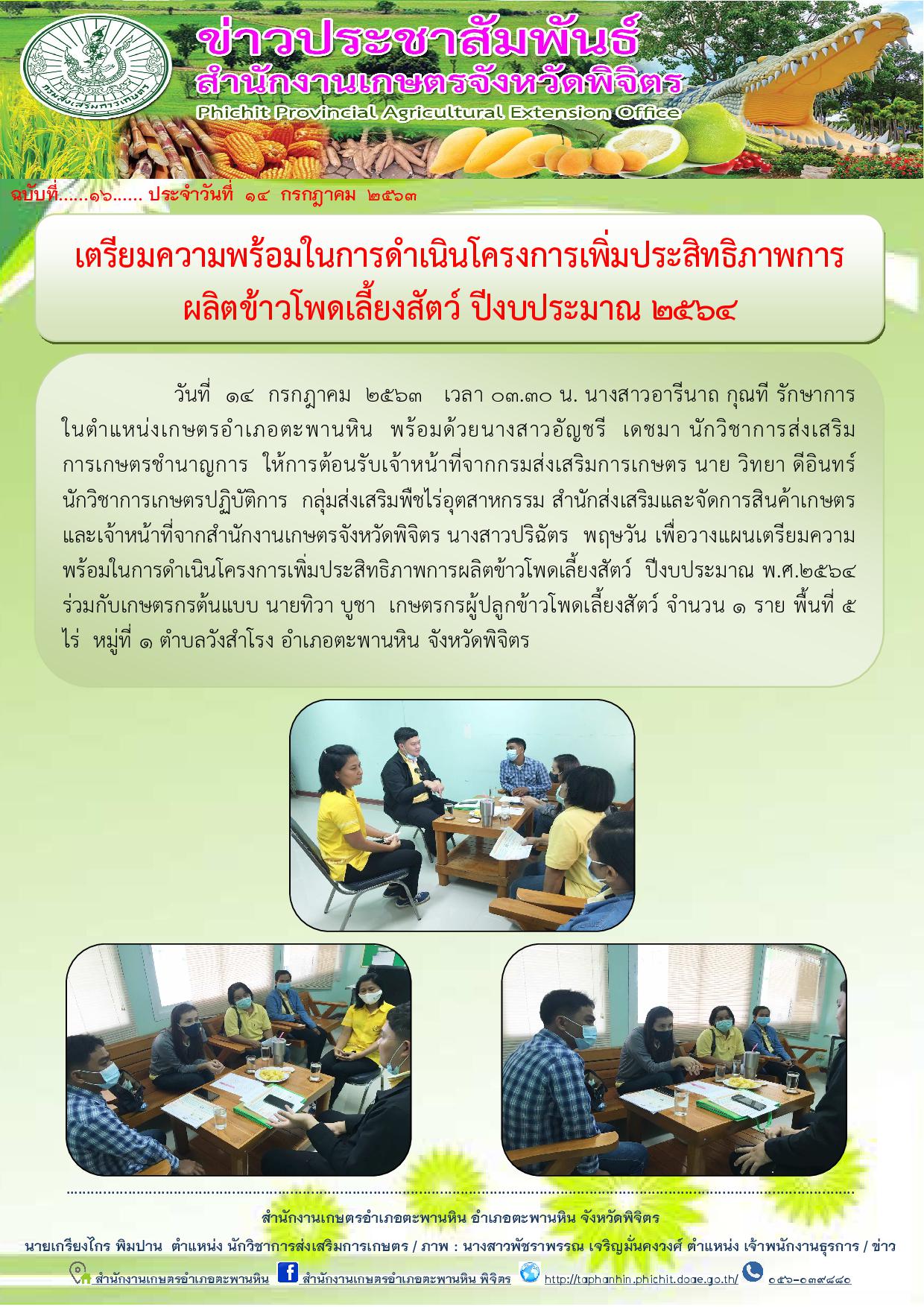 วันที่ 14 กรกฎาคม 2563 เวลา 03.30 น. นางสาวอารีนาถ กุณที รักษาการในตำแหน่งเกษตรอำเภอตะพานหิน พร้อมด้วยนางสาวอัญชรี เดชมา นักวิชาการส่งเสริมการเกษตรชำนาญการ ให้การต้อนรับเจ้าหน้าที่จากกรมส่งเสริมการเกษตร นาย วิทยา ดีอินทร์ นักวิชาการเกษตรปฏิบัติการ กลุ่มส่งเสริมพืชไร่อุตสาหกรรม สำนักส่งเสริมและจัดการสินค้าเกษตร และเจ้าหน้าที่จากสำนักงานเกษตรจังหวัดพิจิตร นางสาวปริฉัตร พฤษวัน เพื่อวางแผนเตรียมความพร้อมในการดำเนินโครงการเพิ่มประสิทธิภาพการผลิตข้าวโพดเลี้ยงสัตว์ ปีงบประมาณ พ.ศ.2564 ร่วมกับเกษตรกรต้นแบบ นายทิวา บูชา เกษตรกรผู้ปลูกข้าวโพดเลี้ยงสัตว์ จำนวน 1 ราย พื้นที่ 5 ไร่ หมู่ที่ 1 ตำบลวังสำโรง อำเภอตะพานหิน จังหวัดพิจิตร
