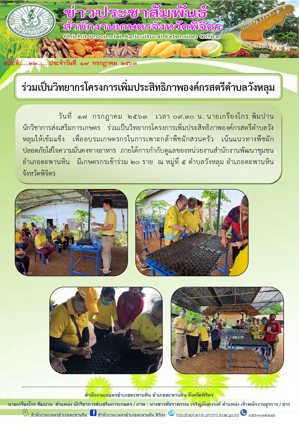 วันที่ 17 กรกฎาคม 2563 เวลา 09.30 น. นายเกรียงไกร พิมปาน นักวิชาการส่งเสริมการเกษตร ร่วมเป็นวิทยากรโครงการเพิ่มประสิทธิภาพองค์กรสตรีตำบลวังหลุมให้เข้มแข็ง เพื่ออบรมเกษตรกรในการเพาะกล้าพืชผักสวนครัว เน้นแนวทางพืชผักปลอดภัยใส่ใจความมั่นคงทางอาหาร ภายใต้การกำกับดูแลของหน่วยงานสำนักงานพัฒนาชุมชนอำเภอตะพานหิน มีเกษตรกรเข้าร่วม 20 ราย ณ หมู่ที่ 5 ตำบลวังหลุม อำเภอตะพานหิน จังหวัดพิจิตร