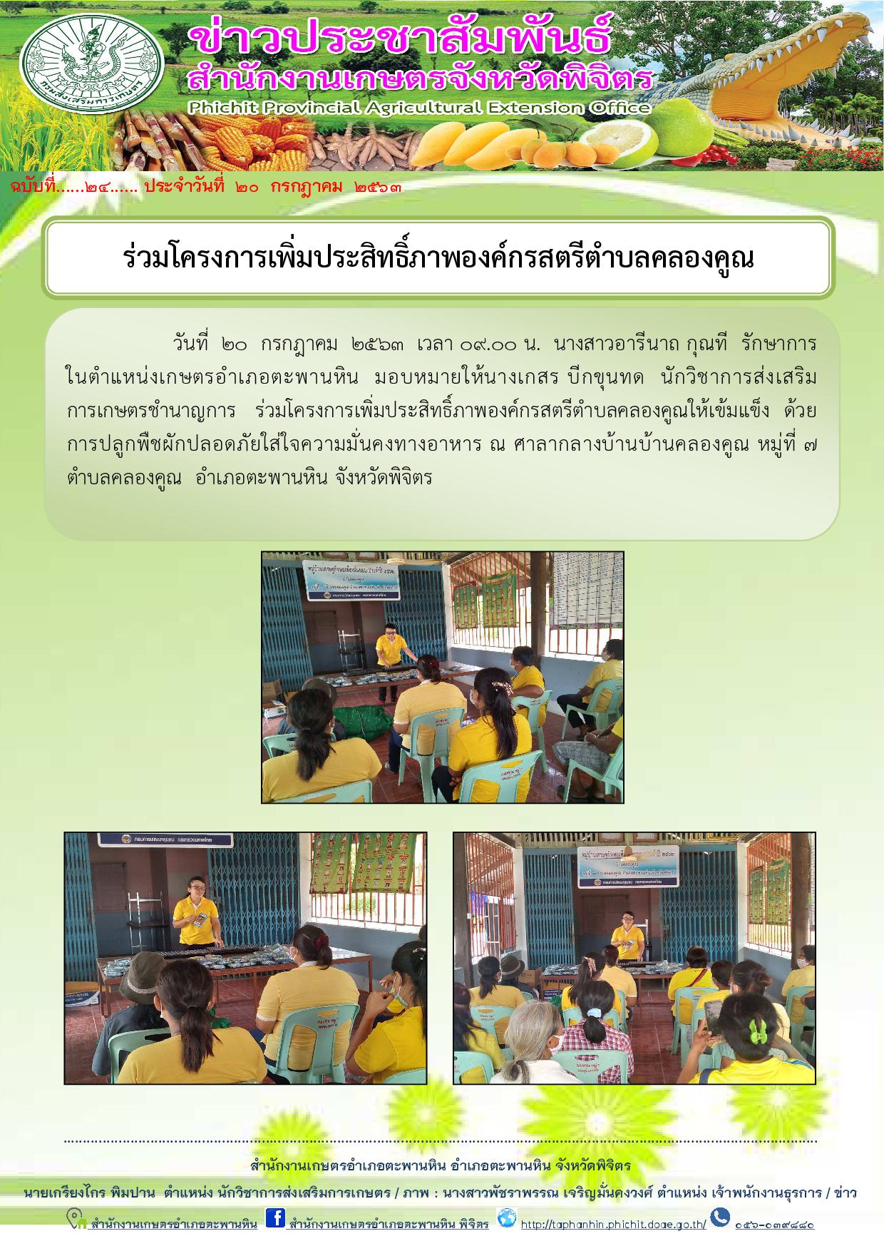 วันที่ 20 กรกฎาคม 2563 เวลา 09.00 น. นางสาวอารีนาถ กุณที รักษาการในตำแหน่งเกษตรอำเภอตะพานหิน มอบหมายให้นางเกสร บีกขุนทด นักวิชาการส่งเสริมการเกษตรชำนาญการ ร่วมโครงการเพิ่มประสิทธิ์ภาพองค์กรสตรีตำบลคลองคูณให้เข้มแข็ง ด้วยการปลูกพืชผักปลอดภัยใส่ใจความมั่นคงทางอาหาร ณ ศาลากลางบ้านบ้านคลองคูณ หมู่ที่ 7 ตำบลคลองคูณ อำเภอตะพานหิน จังหวัดพิจิตร