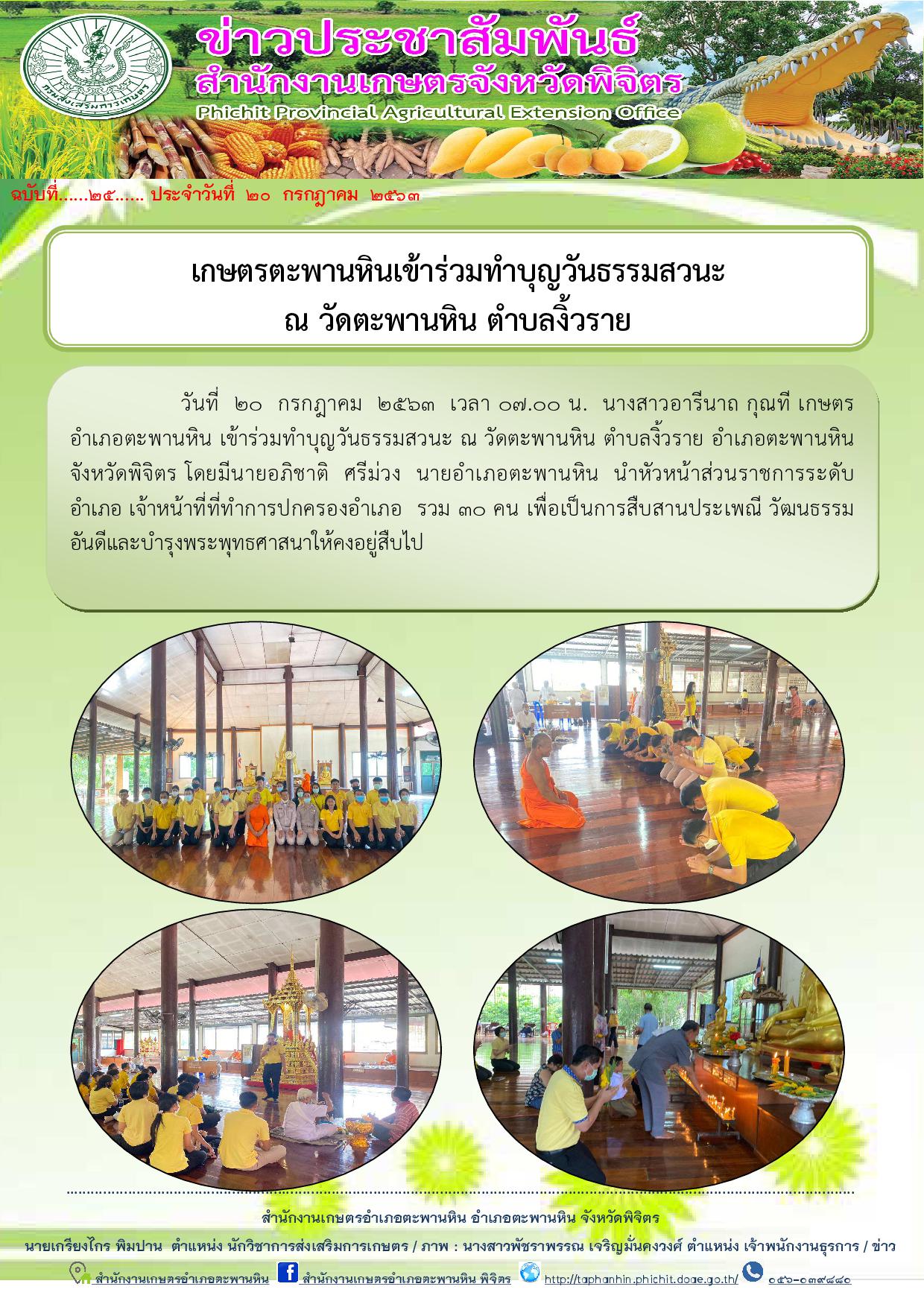 วันที่ 20 กรกฎาคม 2563 เวลา 07.00 น. นางสาวอารีนาถ กุณที เกษตรอำเภอตะพานหิน เข้าร่วมทำบุญวันธรรมสวนะ ณ วัดตะพานหิน ตำบลงิ้วราย อำเภอตะพานหิน จังหวัดพิจิตร โดยมีนายอภิชาติ ศรีม่วง นายอำเภอตะพานหิน นำหัวหน้าส่วนราชการระดับอำเภอ เจ้าหน้าที่ที่ทำการปกครองอำเภอ รวม 30 คน เพื่อเป็นการสืบสานประเพณี วัฒนธรรมอันดีและบำรุงพระพุทธศาสนาให้คงอยู่สืบไป