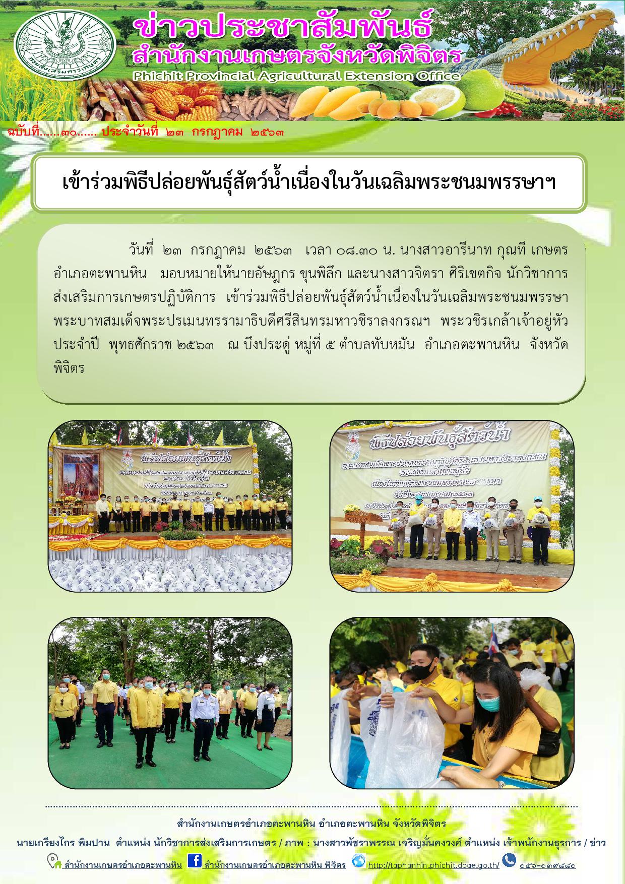 วันที่ 23 กรกฎาคม 2563 เวลา 08.30 น. นางสาวอารีนาท กุณที เกษตรอำเภอตะพานหิน มอบหมายให้นายอัษฎกร ขุนพิลึก และนางสาวจิตรา ศิริเขตกิจ นักวิชาการส่งเสริมการเกษตรปฏิบัติการ เข้าร่วมพิธีปล่อยพันธุ์สัตว์น้ำเนื่องในวันเฉลิมพระชนมพรรษาพระบาทสมเด็จพระปรเมนทรรามาธิบดีศรีสินทรมหาวชิราลงกรณฯ พระวชิรเกล้าเจ้าอยู่หัว ประจำปี พุทธศักราช 2563 ณ บึงประดู่ หมู่ที่ 5 ตำบลทับหมัน อำเภอตะพานหิน จังหวัดพิจิตร